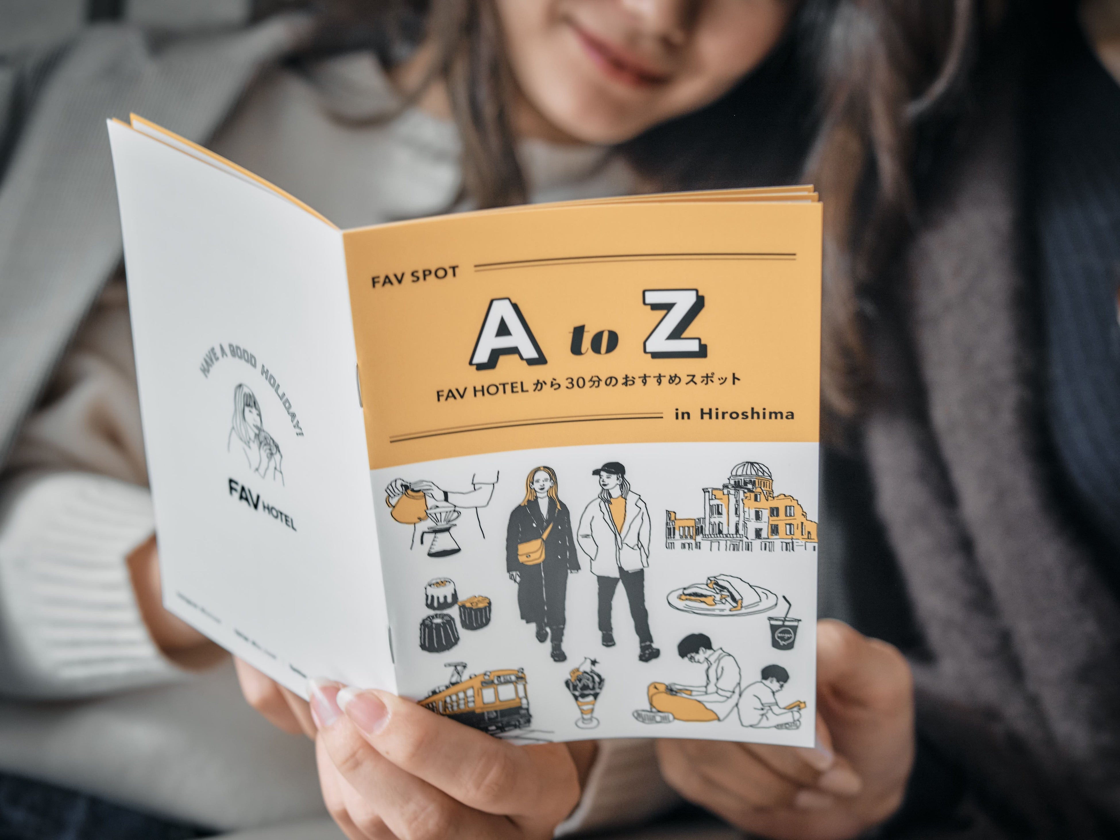 昨今のヘルスツーリズムの人気の高まりを受け、ご宿泊のお客様に徒歩30分以内のスポットを集めたオリジナルの「FAV SPOT AtoZ BOOK」をお配りいたします。ホテルが街の中心部にあり、観光に便利な場所であることから、ご家族や友人とのまち歩きのきっかけになればと、地元で人気の観光名所や飲食店などを広島出身のスタッフが選定。各スポットを表す単語をアルファベットのAからZに当てはめ、全26店舗を10ページのミニ冊子にまとめました。