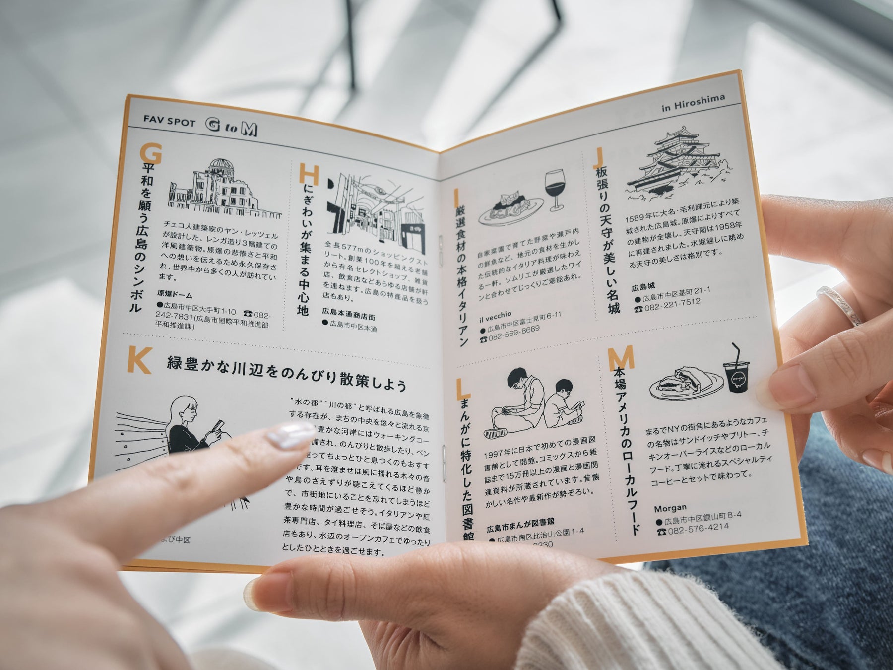地元で人気のスポットを集めたオリジナルの「FAV SPOT AtoZ BOOK」を片手に歩いて旅する広島