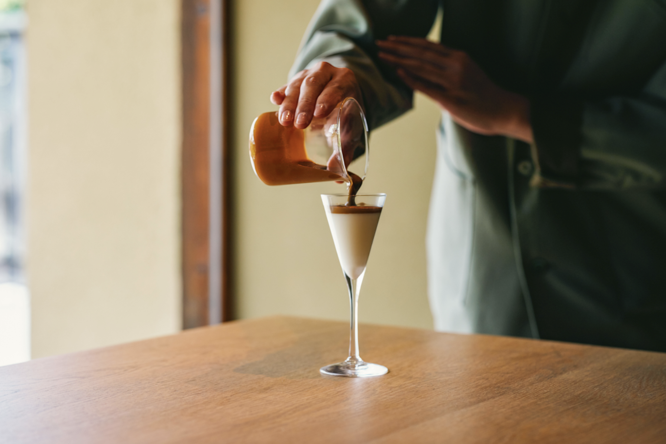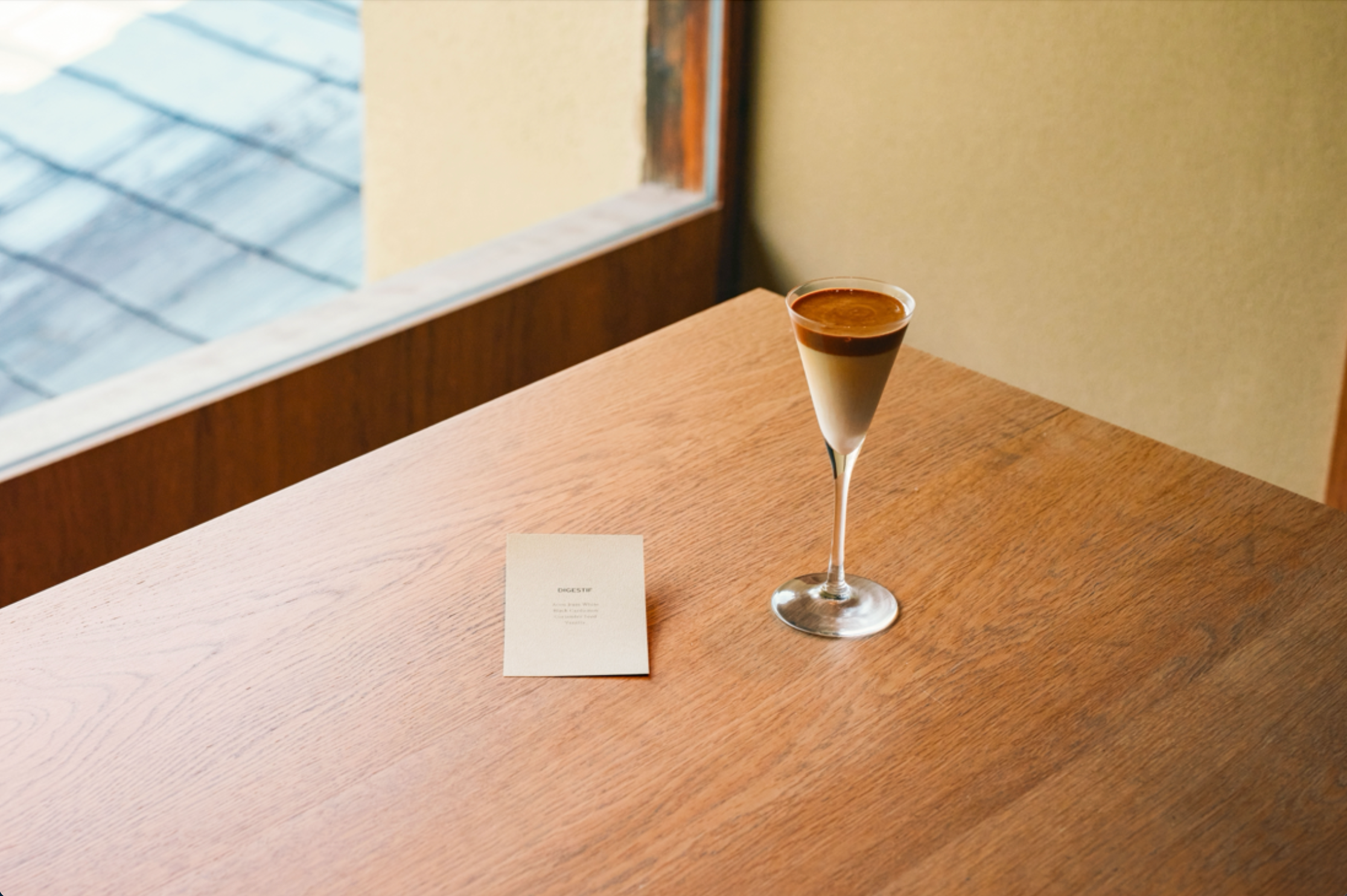 コースを締めくくるのは「ダイジェスティフ」。鹿児島県産のアコウラムやブラックカルダモンなどをコーヒーと合わせて作ったコーヒーホイップをミルクの上に乗せてご提供いたします。