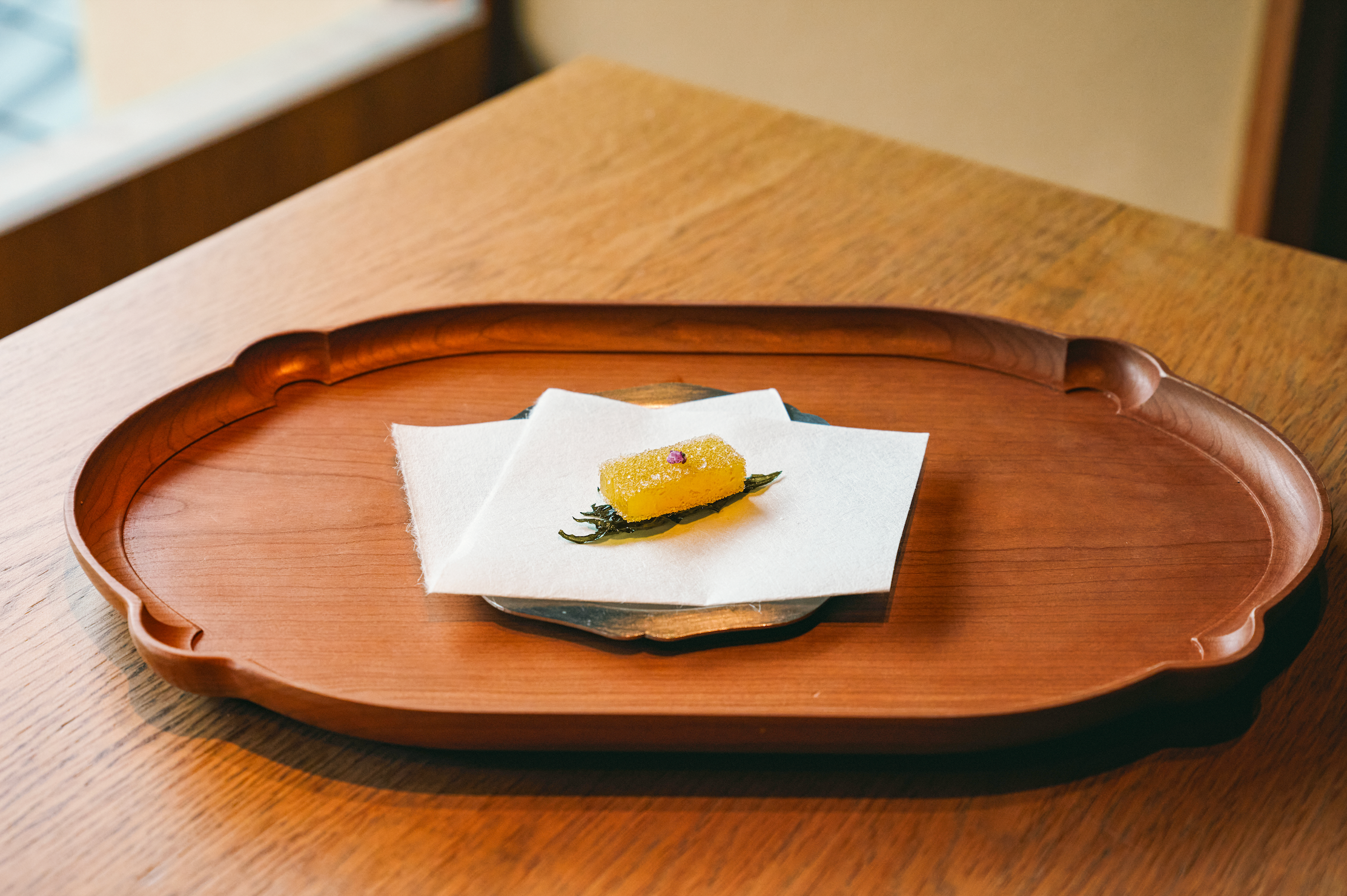 コースの中盤でお口直しとしてご提供する「KOHAKU」は、今回の秋営業に合わせて新たなフレーバーで登場します。金柑の華やかな甘みを閉じ込めたパート・ド・フリュイに、柚子の酸味と香り、紫蘇の清涼感を重ね、奥行きのある味わいに仕上げました。和の香味が感じられる一粒は、お口直しとして次に続くコーヒーの味わいを一層引き立てます。