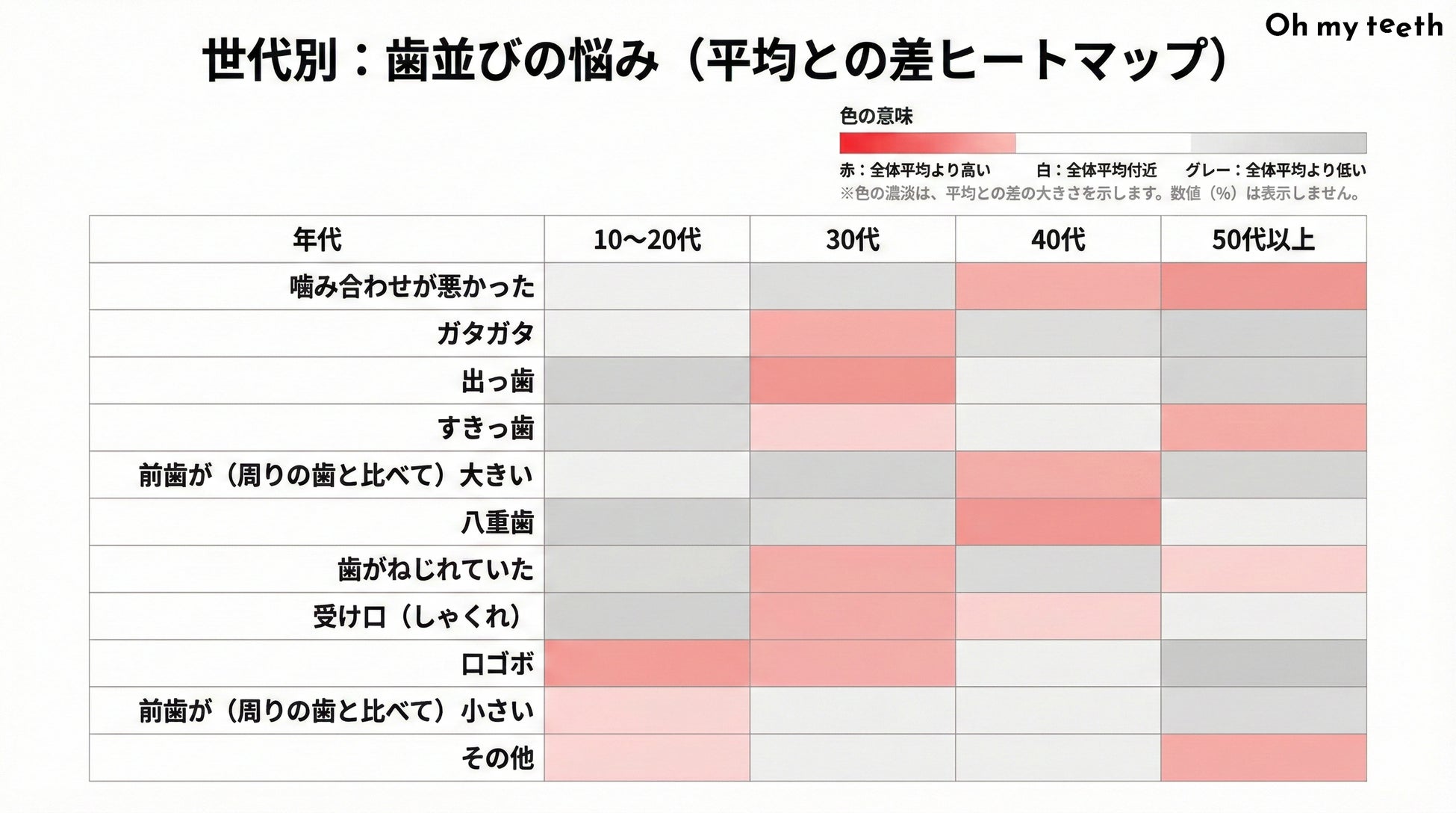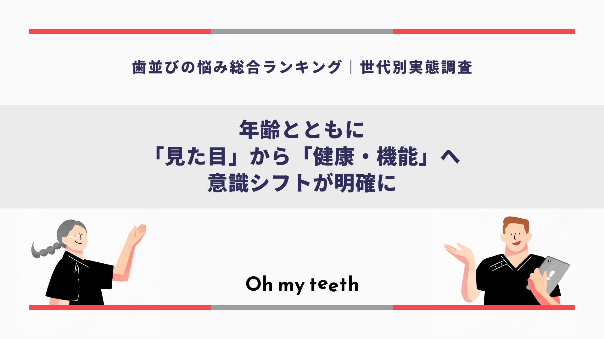全世代の中で唯一、機能面と審美面の悩みが同程度の割合で並びました。40代以降で機能面の悩みが突出する前の、まさに過渡期的な傾向を示しています。