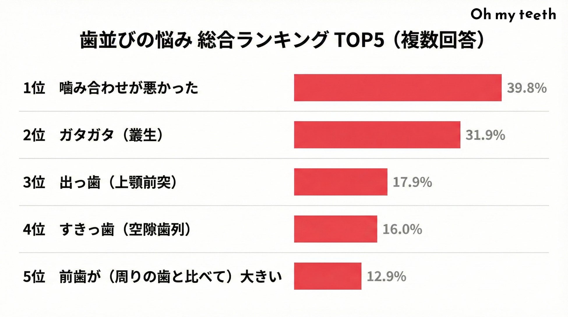 1位は「噛み合わせ(39.6%)」でしたが、2位の「ガタガタ(31.3%)」との差はわずか8ポイント程度でした。