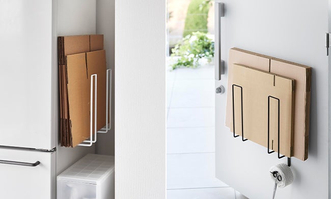 置き場所に困るダンボールをマグネットで冷蔵庫横の隙間や玄関扉にスリムに収納。