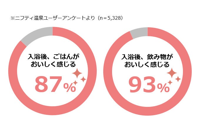 ニフティ温泉のアンケート結果でも、「入浴後はごはんがおいしく感じる」と回答した人87%と、同じような感覚の方が多いことがわかります。ぜひ、入浴後の「ふろ飯」を楽しんでみてくださいね。