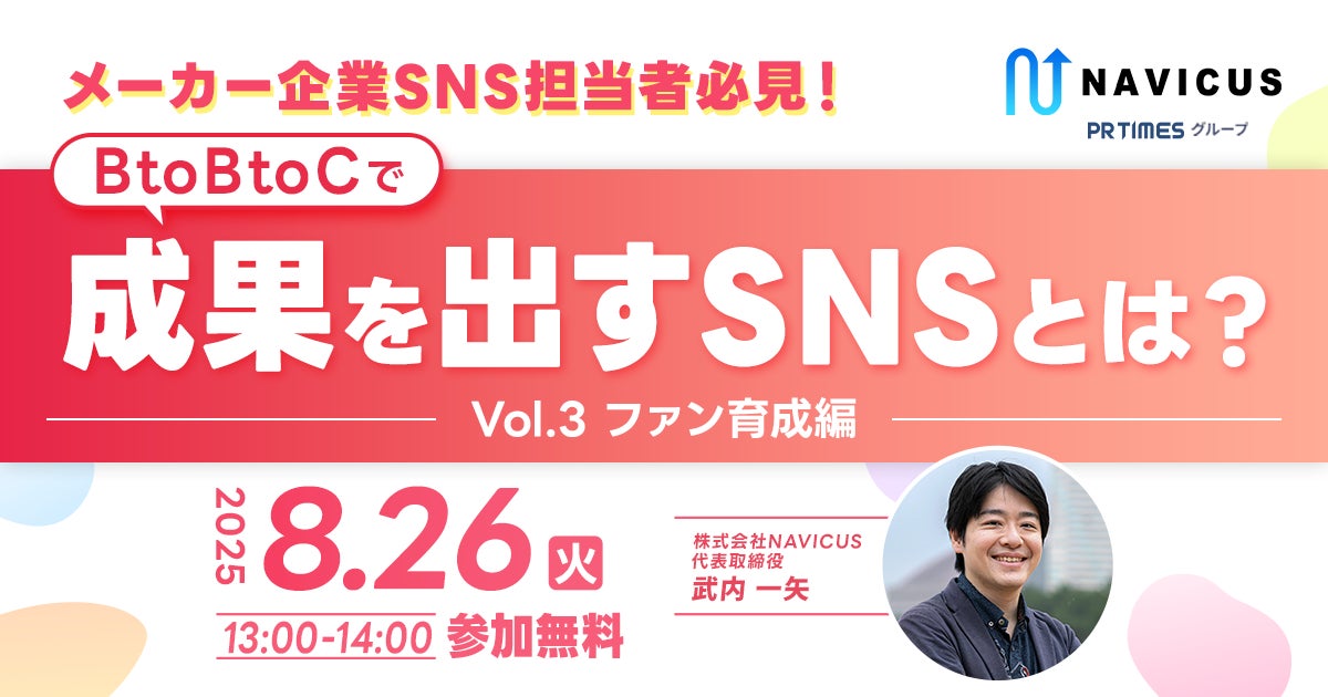 SNSを通じて企業様や地方自治体様のコミュニケーション支援サービスを提供する株式会社NAVICUS(本社:東京都千代田区、代表取締役:武内 一矢、以下:NAVICUS)は、2025年8月26日(火)に無料ウェビナー「メーカー企業SNS担当者必見!BtoBtoCで成果を出すSNSとは?〜Vol.3 ファン育成編〜」を開催いたします。