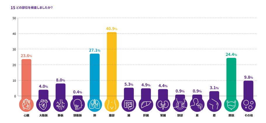 ・診療情報:56%が訪問診療、残り44%が往診。ポケットエコーを使用した要因でまず挙げられるのが、「主訴の要因確認のため」77.8%、次いで「モニタリングのため」20.9%、「手技(穿刺・胃瘻など)」4.4%の順であった。検査部位に関して最も多い部位は腹部(40.9%)、次いで肺(27.1%)、膀胱(24.4%)、心臓(23.6%)が示された。