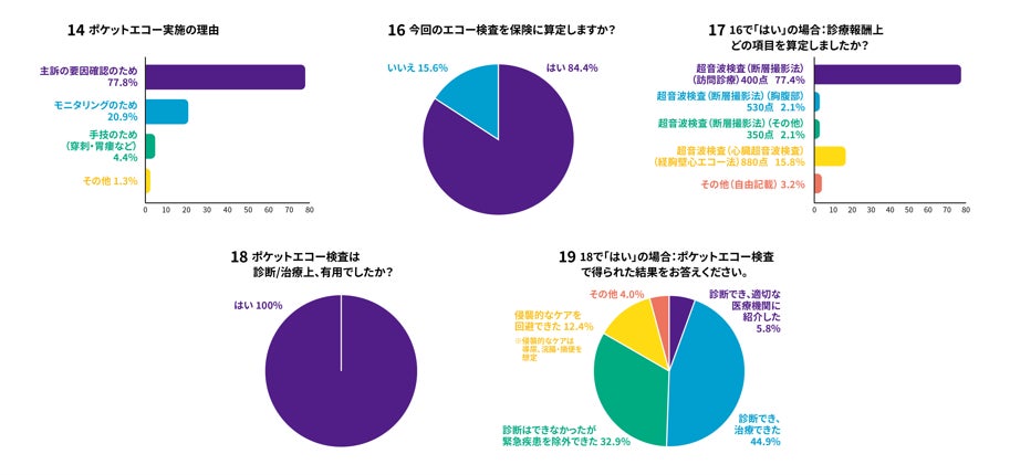 今回の調査では在宅医療における患者情報やその取り巻く環境、及びポケットエコーを利用した場合の診療実態が明らかにされるだけでなく、100%のケースでポケットエコー検査が診断/治療上有用であったと回答されています(設問18グラフ参照)。具体的に得られた結果として、「診察でき、治療できた」(44.9%)と在宅医療のみで診療が完結したケースが全体の約半数にのぼり、次いで「診断はできなかったが緊急疾患を除外できた」(32.9%)と緊急搬送を防止できた群も多くみられました。このことから、ポケットエコー利用により在宅で診療が完結することや救急搬送が防止されることによる救急医療現場の負担低減、さらには患者さんの負担軽減につながっていることが示唆されます。