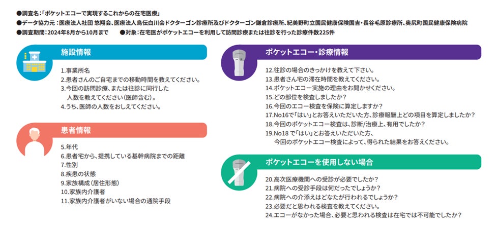 昨年度実施した調査およびその結果については、多くの医療従事者の皆様に高評価いただき、メディアの皆様からも多々ご意見をいただきました。今年は4名の在宅医に協力をいただき実際の検査データを収集した結果、ポケットエコーの活用により在宅医療での診断力が高まり、「在宅で診療が完結すること」や「緊急搬送や再入院の防止」など、ポケットエコーの利用価値やそれによる医療費削減を可視化しています。