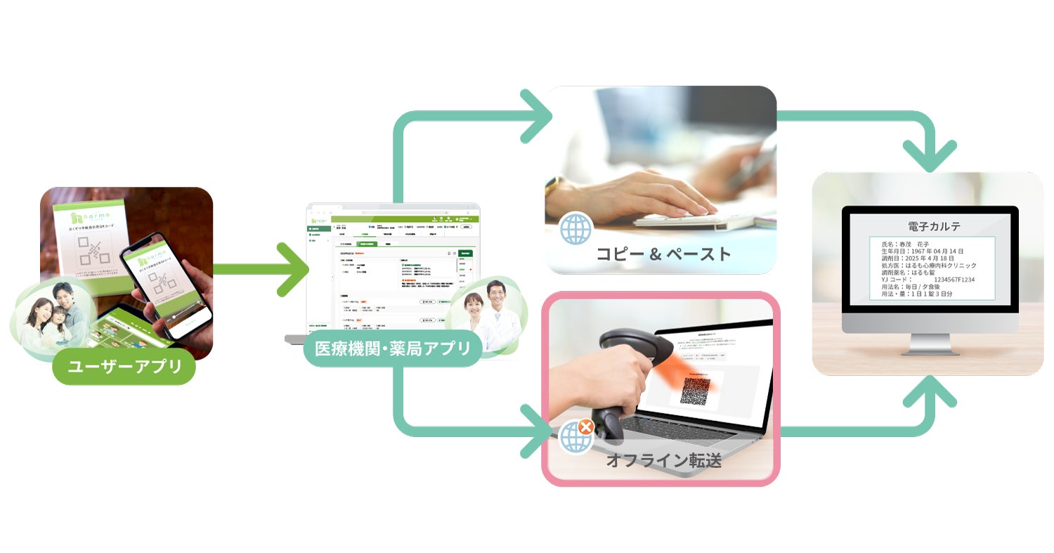 この課題に対し、harmoはインターネットに接続されていない電子カルテに対しても、バーコードリーダーを用いることで、簡単に薬剤情報を転送できる「オフライン転送」機能を新たに開発しました。オフライン転送により、医療機関での持参薬確認における転記ミスの防止や、カルテへの情報取り込み作業の効率化につなげます。