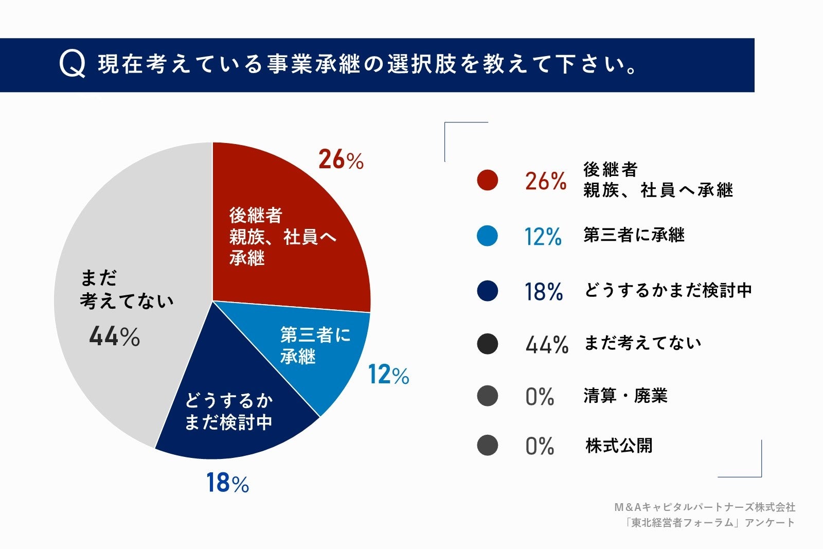 現在考えている事業承継の選択肢は、「後継者親族、社員へ承継 26%」、「第三者に承継 12%」、「どうするか検討中 18%」、「まだ考えていない 44%」という結果でした。