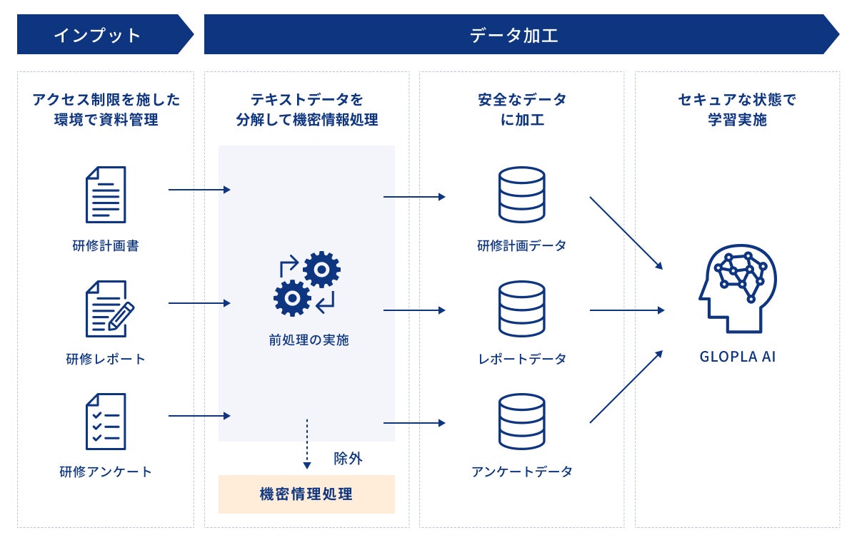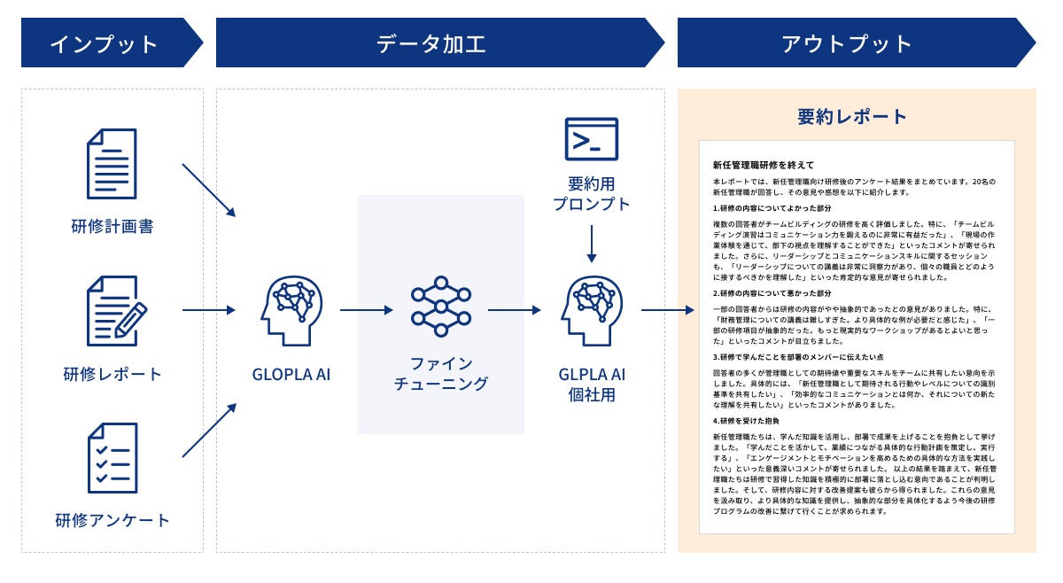 グロービスはこれまでに約6,700社に対して人材育成サービスを提供し、受講者数は累計約230万人にのぼります。「GLOPLA AI 」は企業研修事業で得た知見を元に、グロービス独自のファインチューニング*1を実施したAIモデルを構築しています。さらに「GLOPLA AI」は、導入企業ごとに個別化されたAIモデルを構築し、各社にとって最適な人材育成をアドバイスします。