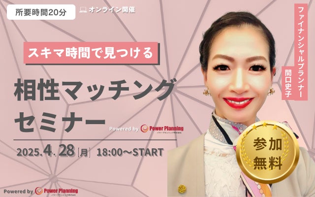 無料マネーセミナー提供サービス「アットセミナー」を運営しているパワープランニング株式会社が「4月28日 (月)18時」に「相性マッチングセミナー」というスキマ時間で自分に合ったFPを見つけられるオンラインセミナーを開催いたします。
