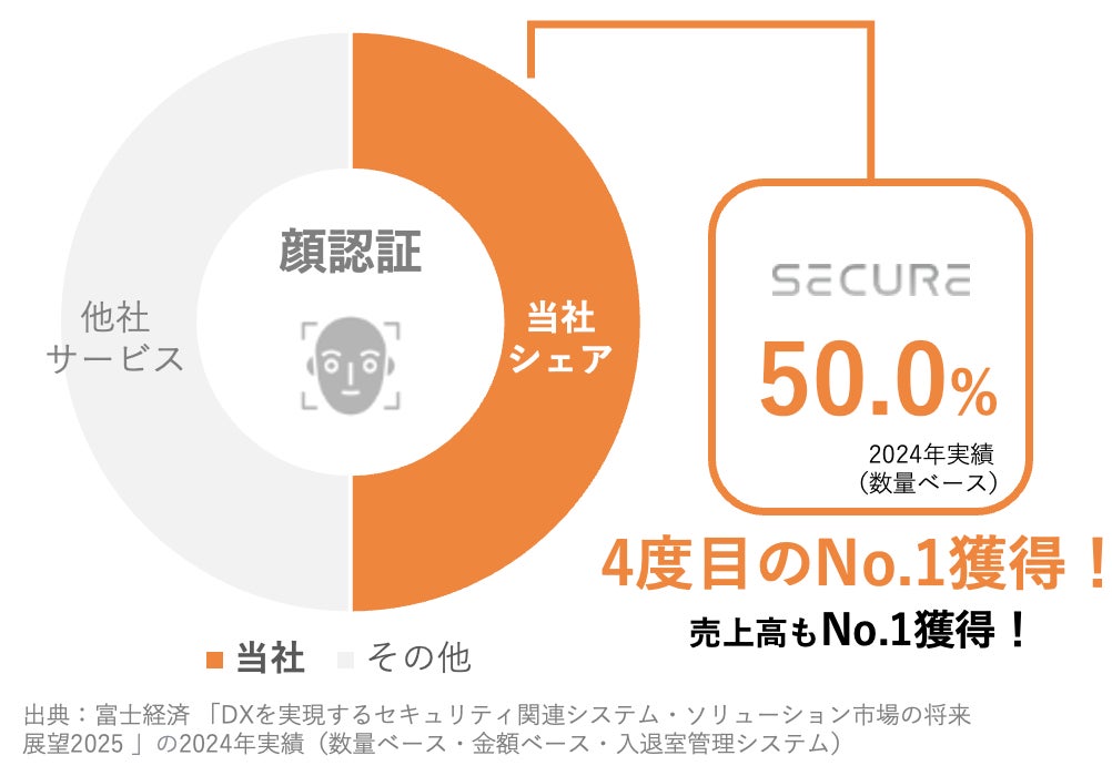 「AI(画像解析)×セキュリティ」で企業の課題解決のためのビジネスソリューションを提供する株式会社セキュア(本社:東京都新宿区 代表取締役社長:谷口 辰成、証券コード:4264、以下「セキュア」)の提供している顔認証入退室管理システムが、入退室管理用途の2024年顔認証機器の出荷台数において、2020年から2022年の3年連続に引き続き、マーケットシェアNo.1を獲得したことをお知らせします。また売上高においてもマーケットシェアNo.1を獲得しています。