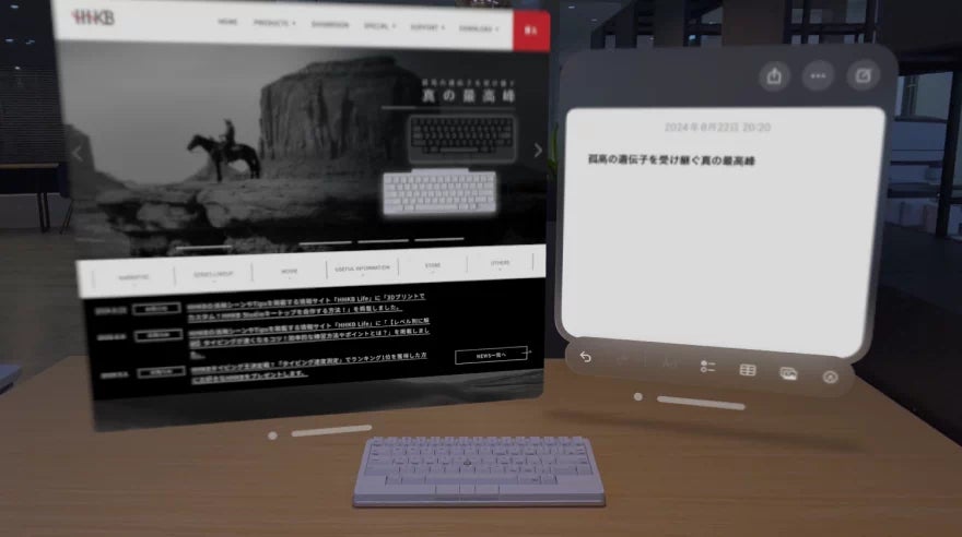 ※visionOS 2(Beta4)にて、HHKB Studioのキー入力に加え、ポインティングスティックおよびジェスチャーパッドが動作することを確認しています。2024年9月17日に正式リリースされたvisionOS 2での動作確認を進めております。最終確認が出来次第、別途お知らせいたします。なお、visionOSで対応していないコマンドは動作いたしません。