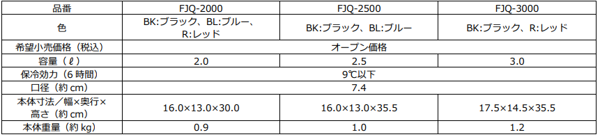 『サーモス 真空断熱スポーツジャグ(FJQ-2000/2500/3000)』 仕様一覧