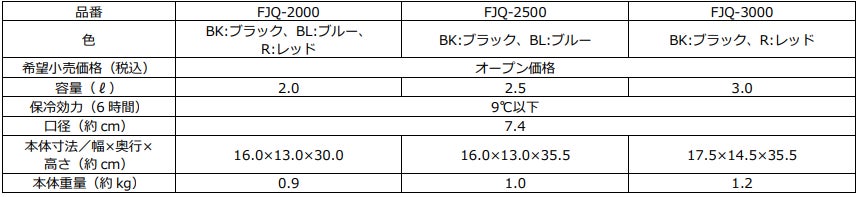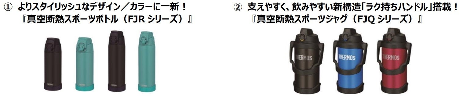 前モデルであるFJH/FJCシリーズは、スポーツシーンの水分補給に最適な商品として多くのお客様にご好評をいただきました。今回より落ち着いたトーンのカラーリングにリニューアルしたほか、スタイリッシュなデザインに変更することで、より幅広い年代のお客様にお使いいただけるようにしました。
