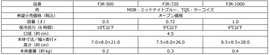 『サーモス 真空断熱スポーツボトル(FJR-500/720/1000)』 仕様一覧