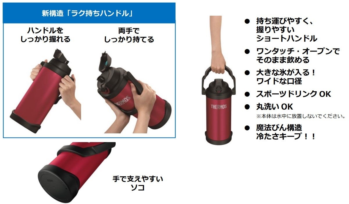 スポーツシーンに適した温度で水分補給ができるよう、大きな氷が入るワイドな口径。ステンレス製魔法びん構造で冷たさをキープします。ワンタッチ・オープンで使いやすく、キャップユニットはロックリング付きであるため、内容物が漏れず、砂ぼこりも防げます。また小さなお子様でも引きずらないで持ち運びができるよう、既存品と比べてハンドルを短くしました。