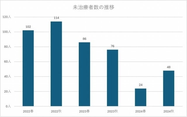 定期健康診断の結果、二次健診対象となったタクシー乗務員のうち、血圧の治療を開始していない乗務員が、2022年春の健康診断時点で100名に対し、2024年秋の健康診断では、48人に減少しました。