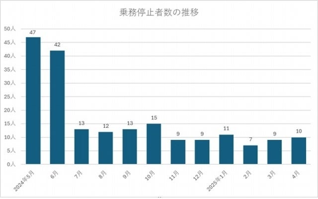 定期健康診断の二次健診で高血圧と診断された乗務員、および治療中のタクシー乗務員全員に対して、毎出番乗務前に血圧の測定を実施しています。複数回にわたり基準値(170/110mmHg)以上の測定結果が出た場合は、乗務を見合わせるものとし、治療を推奨しています。基準値を超えて乗務が停止される乗務員の月ごとの数が、講習会前の2024年6月は42名であったところ、2025年4月は10名まで減少しました。