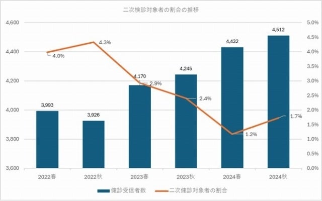 年2回の定期健康診断を受診したタクシー乗務員のうち2022年は4%以上、2023年は2%以上いた二次健診対象者が2024年秋の健康診断では1.7%まで減少しました。