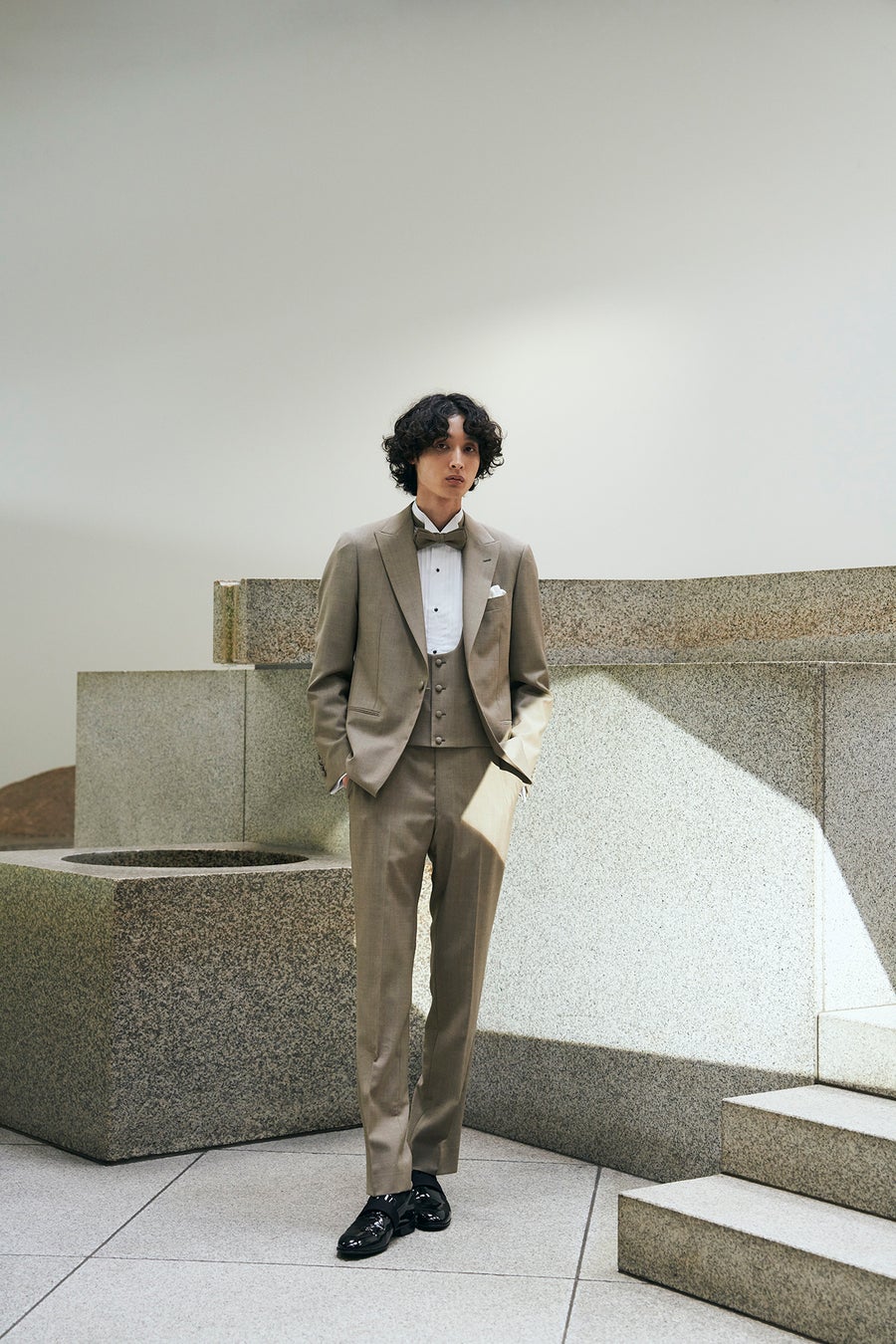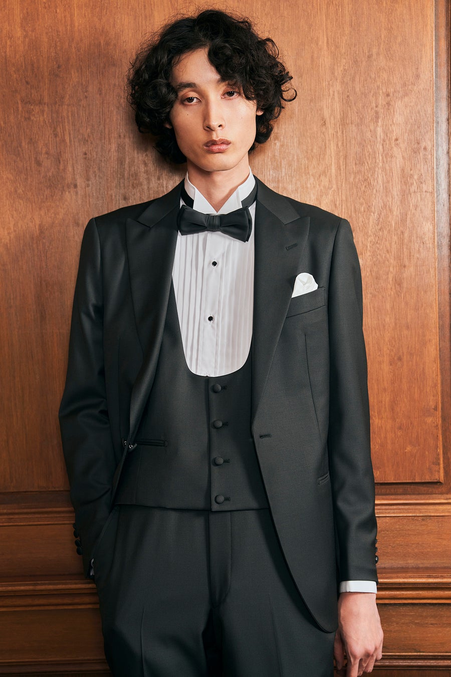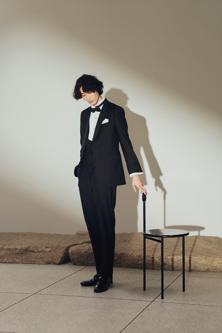 ユナイテッドアローズオリジナルパターン(原型)で作られたタキシードは、シンプルなデザインの中に、上質な素材使いで美しさを追求した全6モデルを展開。視線が集まる襟ラペルは印象が変わる「ショールカラー」、「ピークドラベル」をややシャープに仕上げることで、現代的な着やすさを生みだしました。