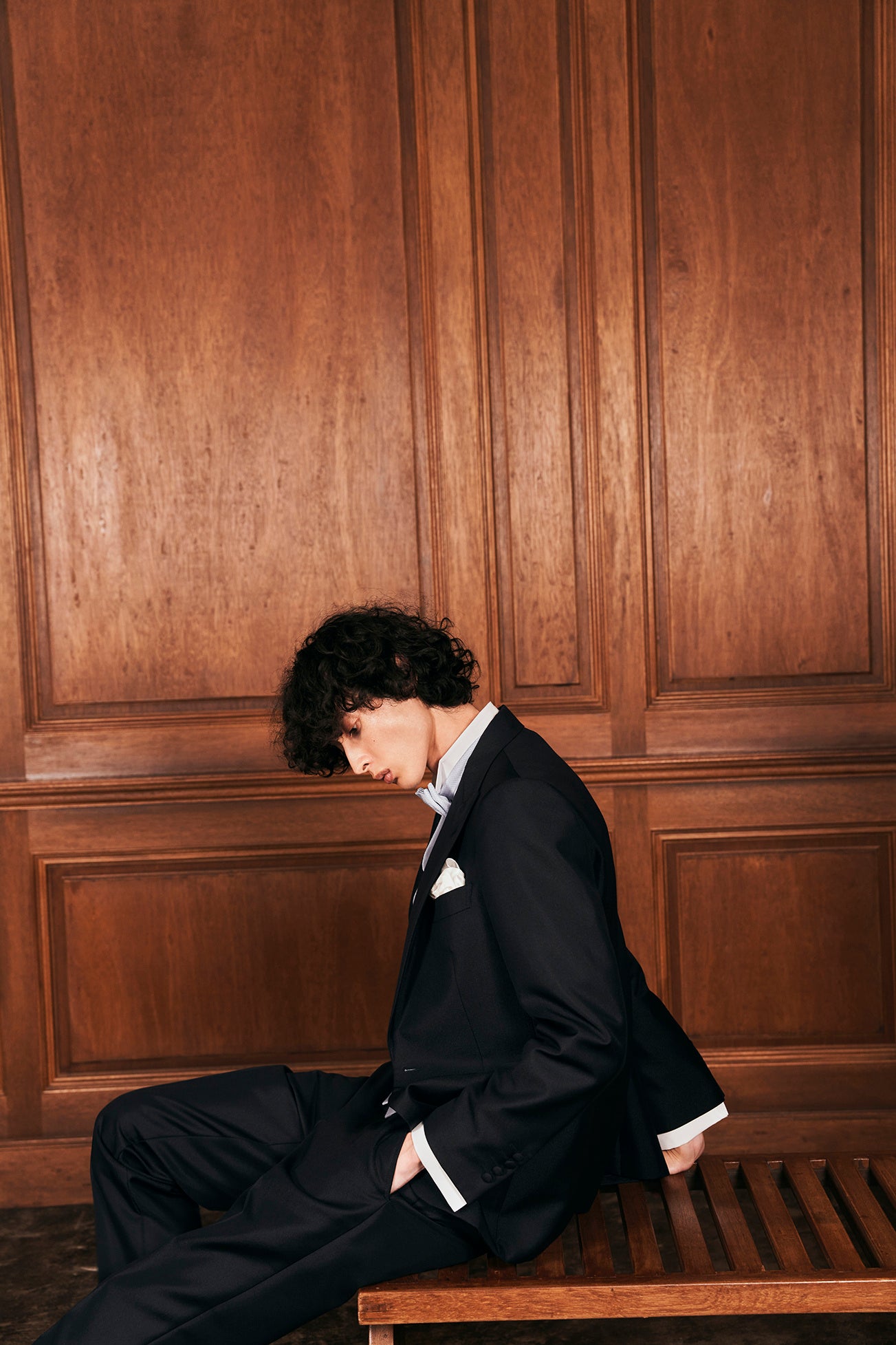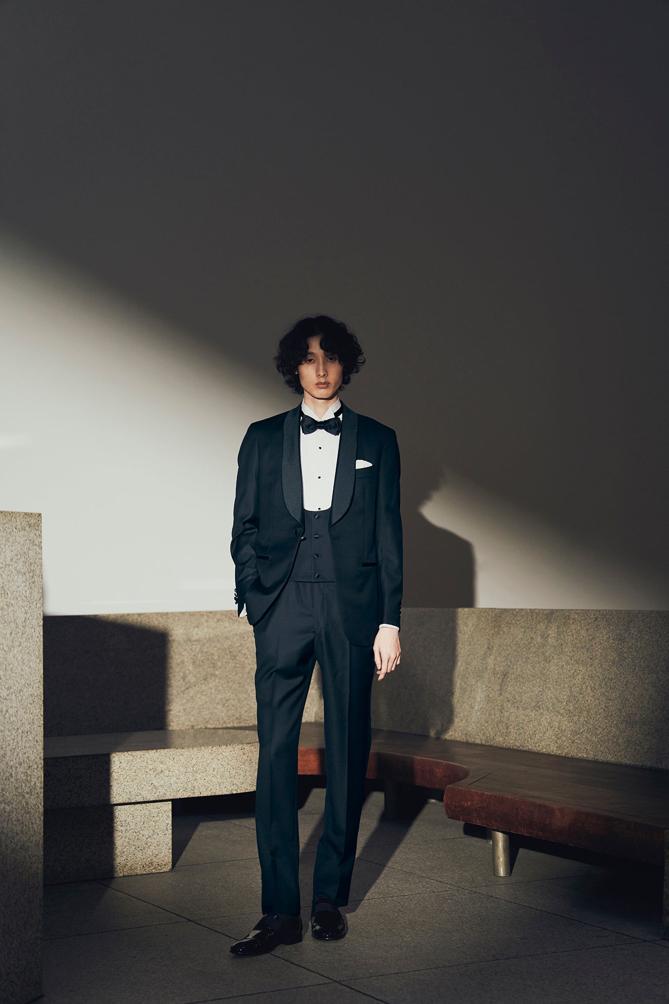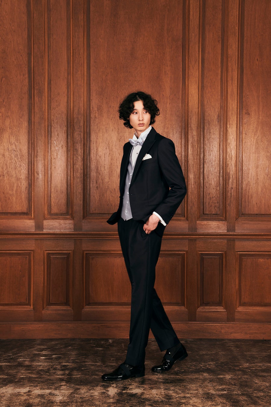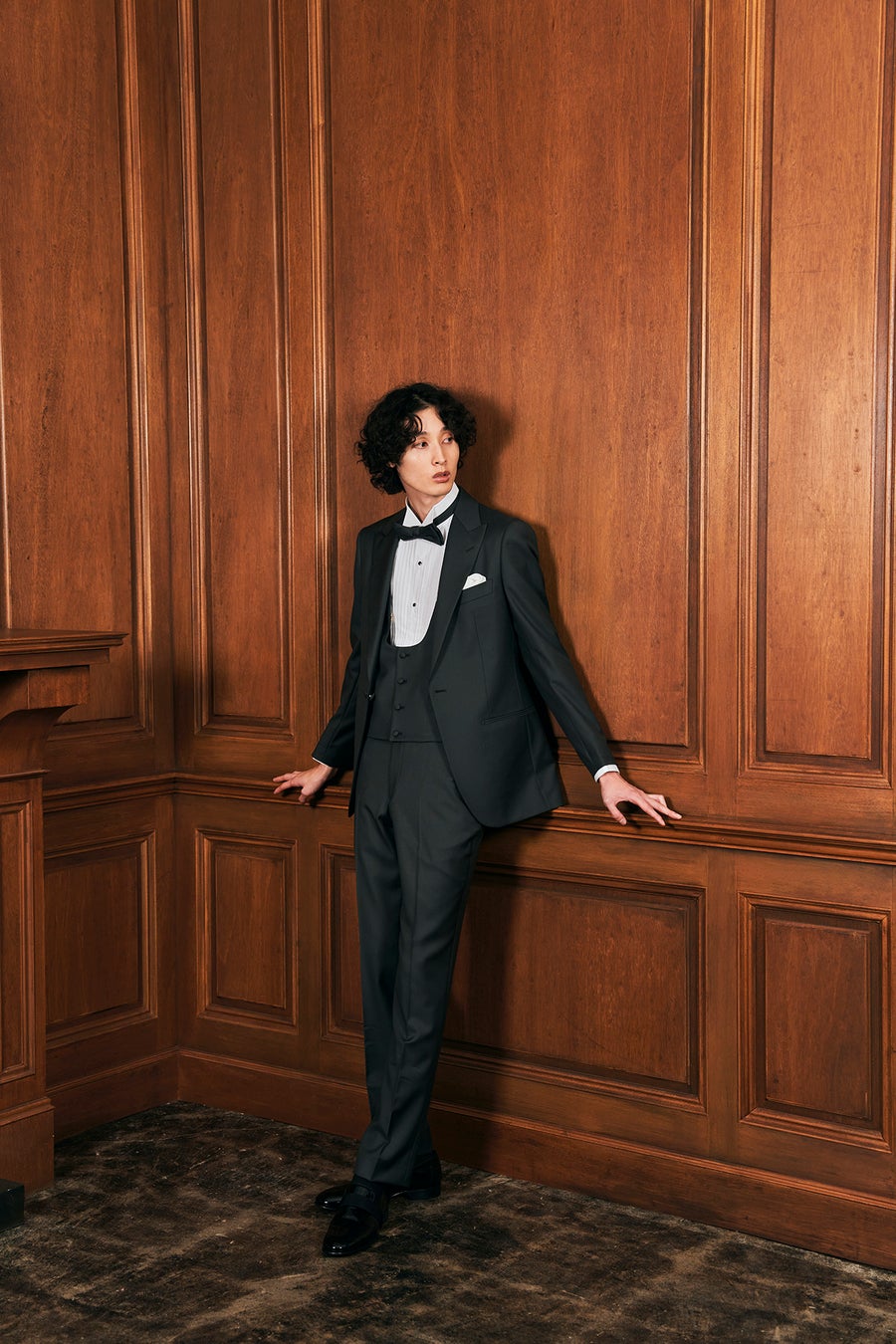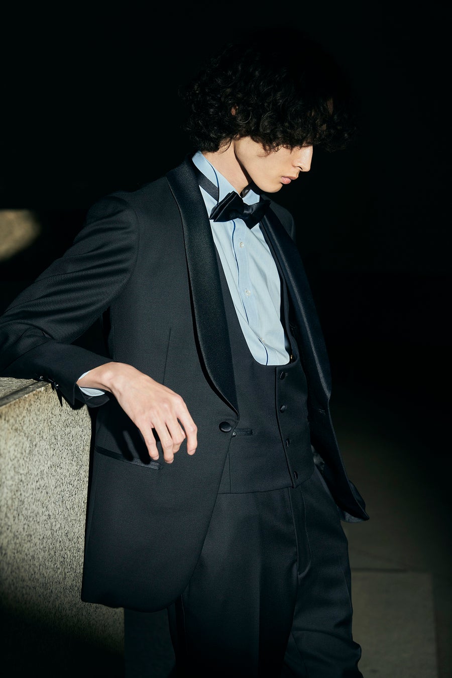 タキシードになじむ薄いブルーのシャツを内に取り入れたスタイリングで洒脱な装いを演出。