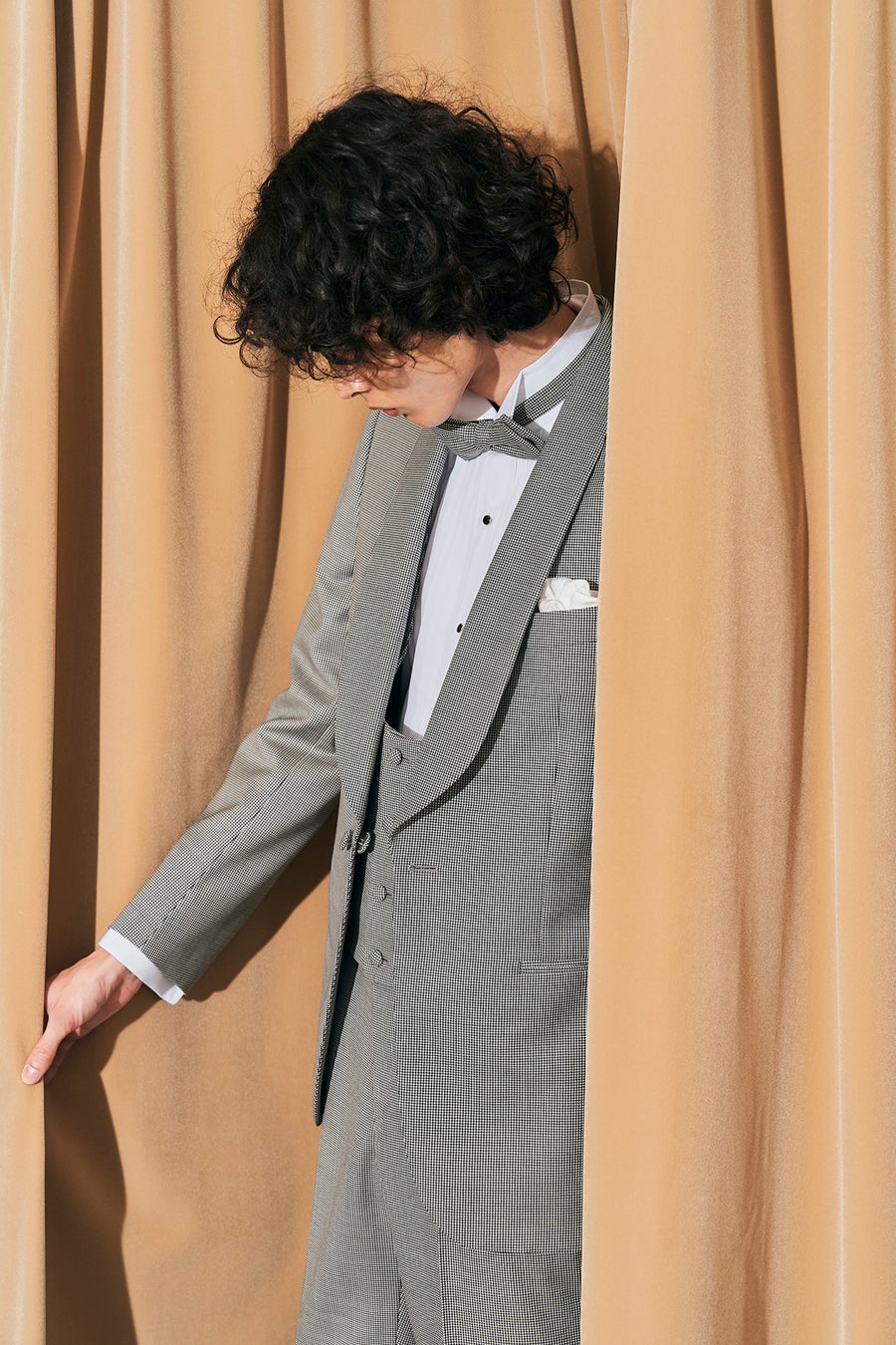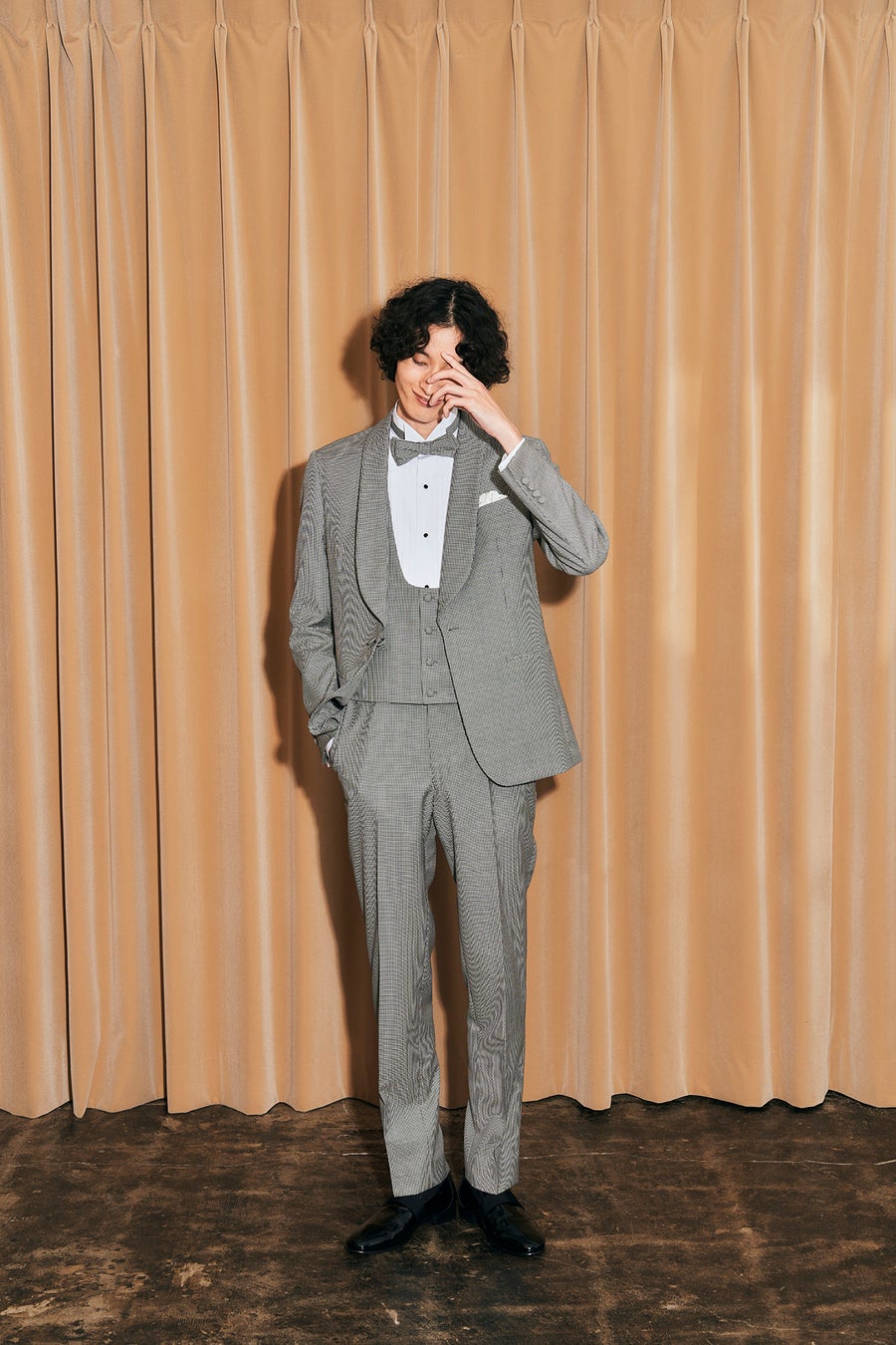 タキシードでは珍しいハウンドトゥース(千鳥格子)は、英国紳士的なエレガントさを感じる一着。柄の印象が強すぎないので花嫁の個性をより引き立てます。特に純白やパステルカラーのドレスとの相性は抜群です。