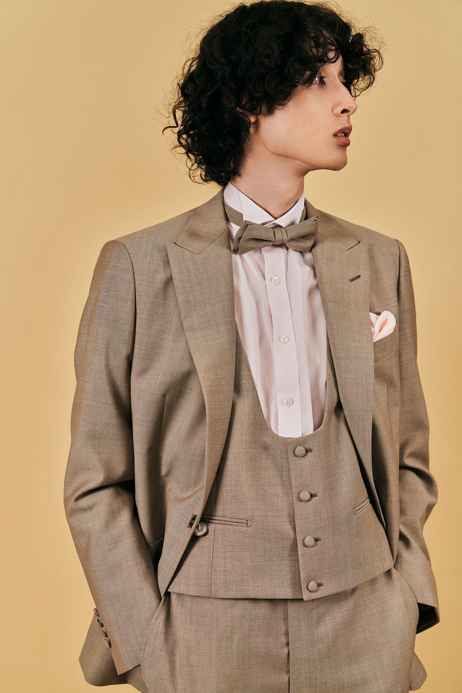 ガーデンウェディングやリゾートウエディングにもおすすめなのが、イタリアの老舗ファブリックメーカー「マルゾット」の生地を使用したベージュのタキシード。品の良さと抜け感のバランスが絶妙で、かしこまりすぎず洒落感を出すことができます。
