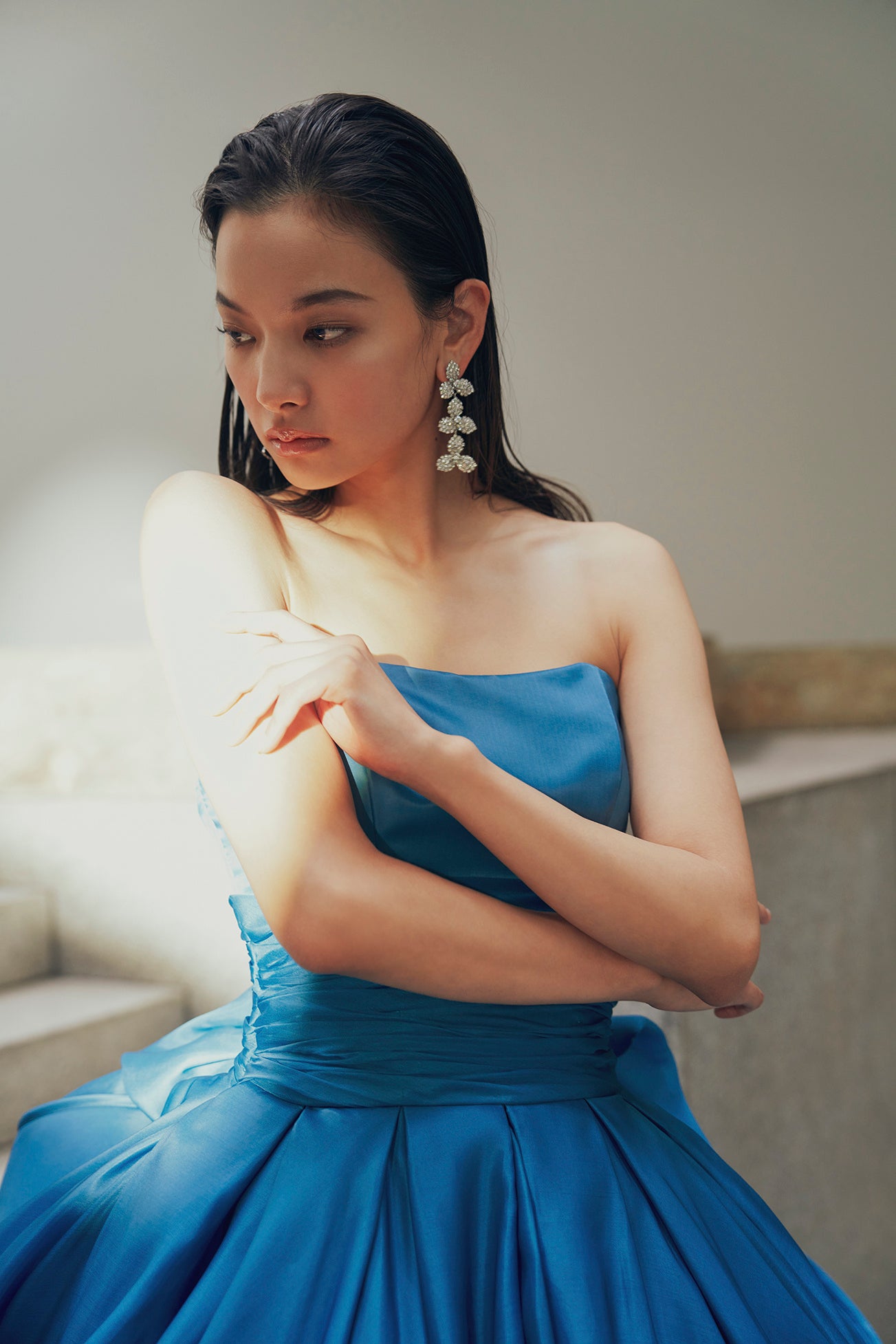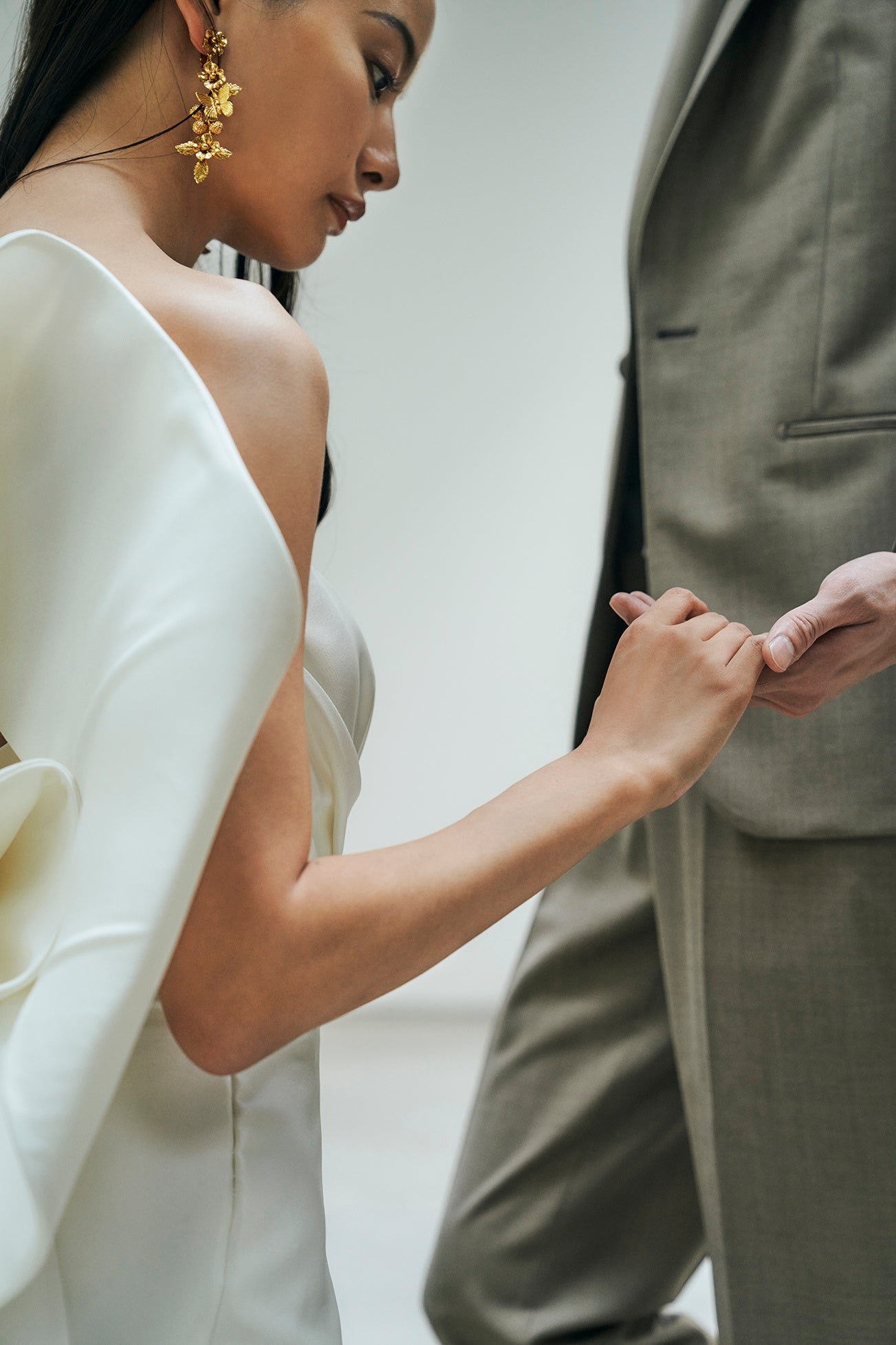 クラシックかつノーブルな佇まいで、花嫁姿に華を添えてくれます。定番の白シャツ合わせはもちろん、薄いブルーのカラーシャツで遊びを加えるのも素敵です。