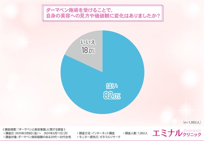 「ダーマペン施術を受けることで、自身の美容への見方や価値観に変化はありましたか?」と質問したところ、約8割の方が『はい(82.0%)』と回答しました。