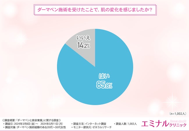 「ダーマペン施術を受けたことで、肌の変化を感じましたか?」と質問したところ、約9割の方が『はい(85.8%)』と回答しました。