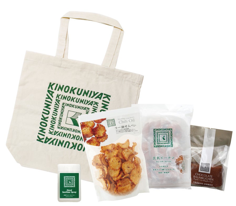 ラー油せんべい、豆乳ドーナツ、チョコレートバウムクーヘン、カード式アルコールスプレー、コットンバッグ グリーン