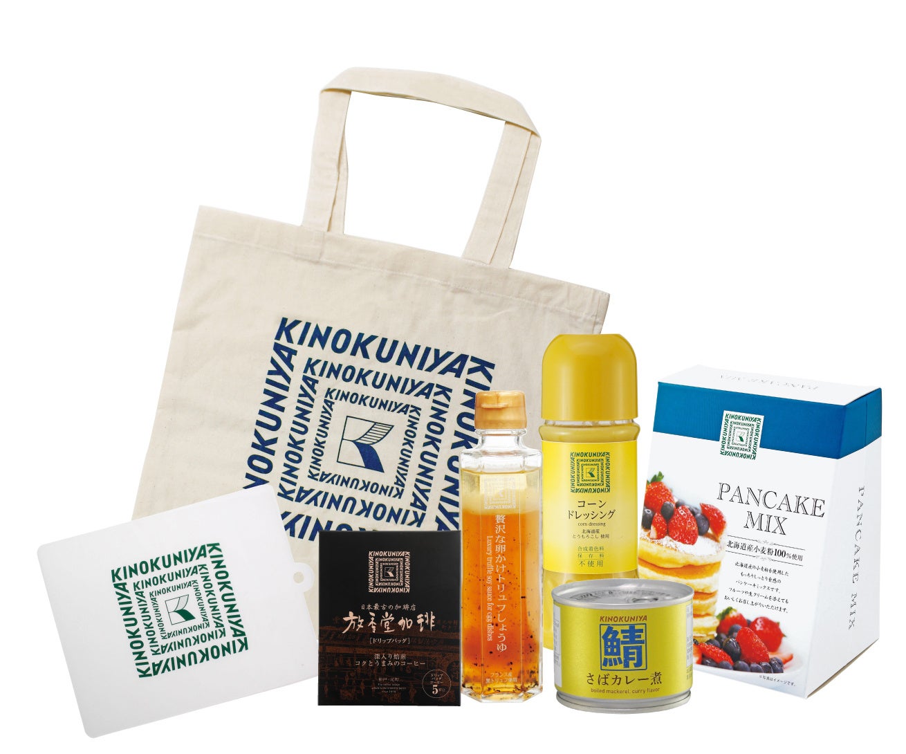 パンケーキミックス、贅沢な卵かけトリュフしょうゆ、さばカレー煮、コーンドレッシング、放香堂加琲ドリップパッグ、ミニシートまな板1枚、コットンバッグ ブルー