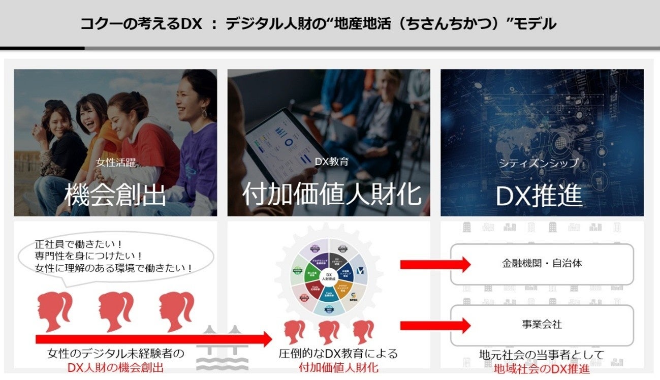 地方創生を実現するためにコクーが提唱するのが「デジタル人財の地産地活(ちさんちかつ)モデル」です。これは地元のデジタル未経験者をコクーの正社員として雇用、DX人財として育成し、地元企業のDX推進を支援するエコシステムをその地域につくる取り組みです。