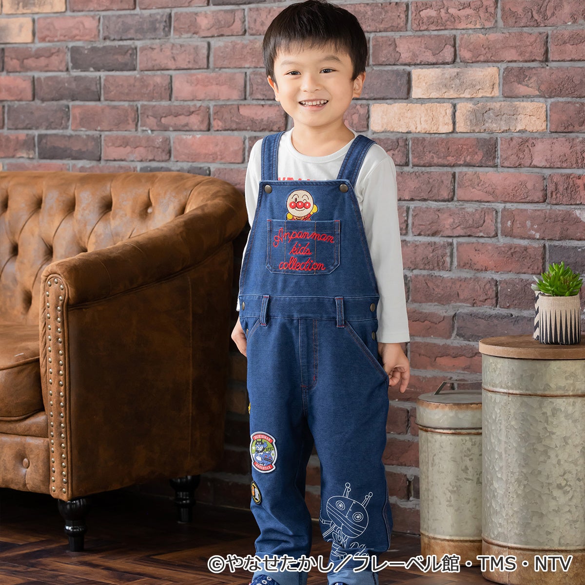 オーバーオールにはばいきんまん・だだんだん、カレーパンマン・しょくぱんまんのワッペンと、だだんだんの刺繍が施されています。背面のポケットにはアンパンマン・ばいきんまんの刺繍がデザインされています。