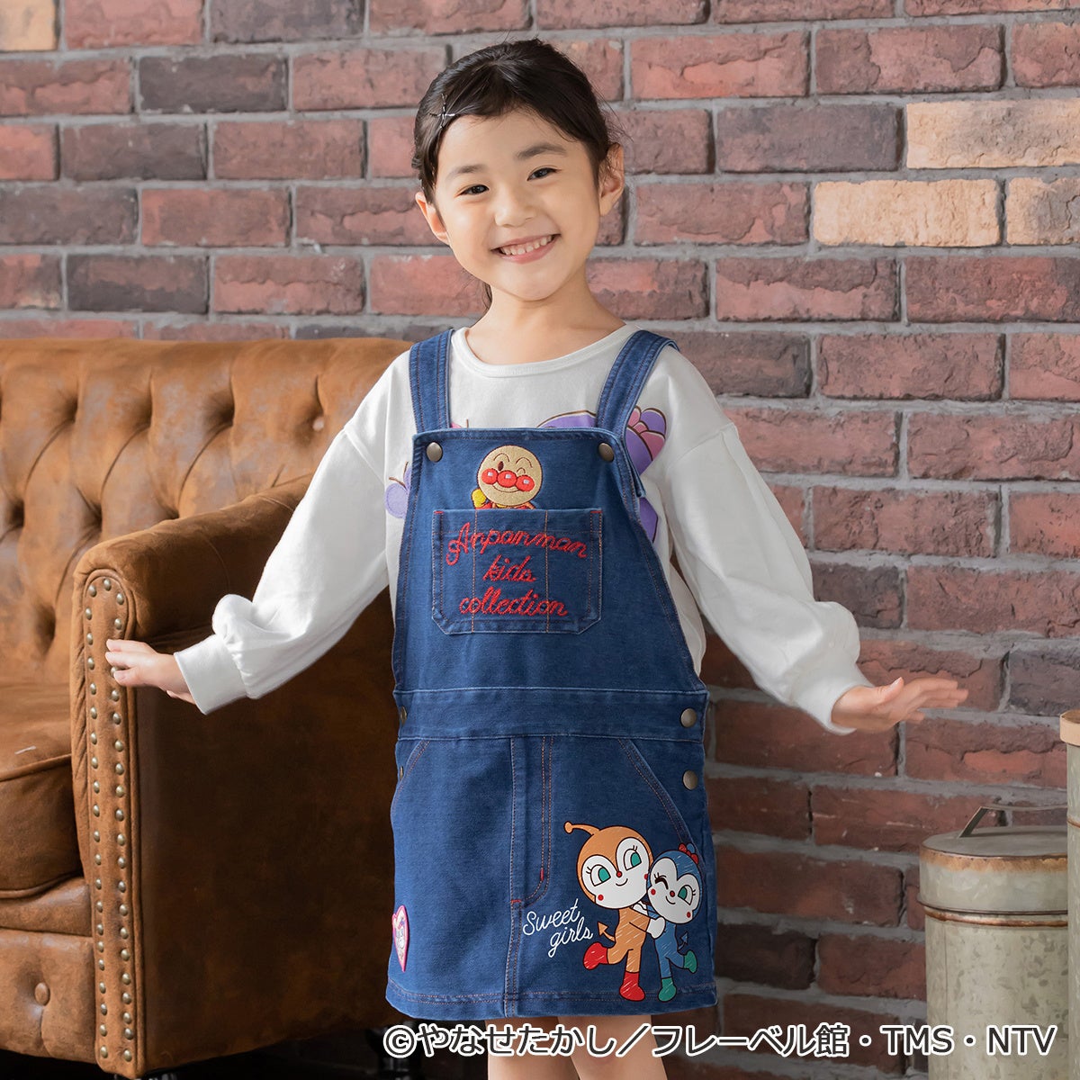 正面のポケットからちょこんと覗いたアンパンマンの刺繍がかわいらしいデザインのオーバーオールとジャンパースカートです。