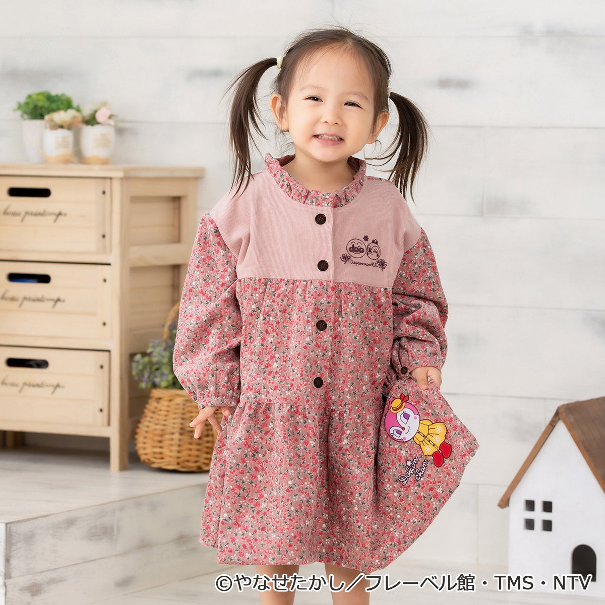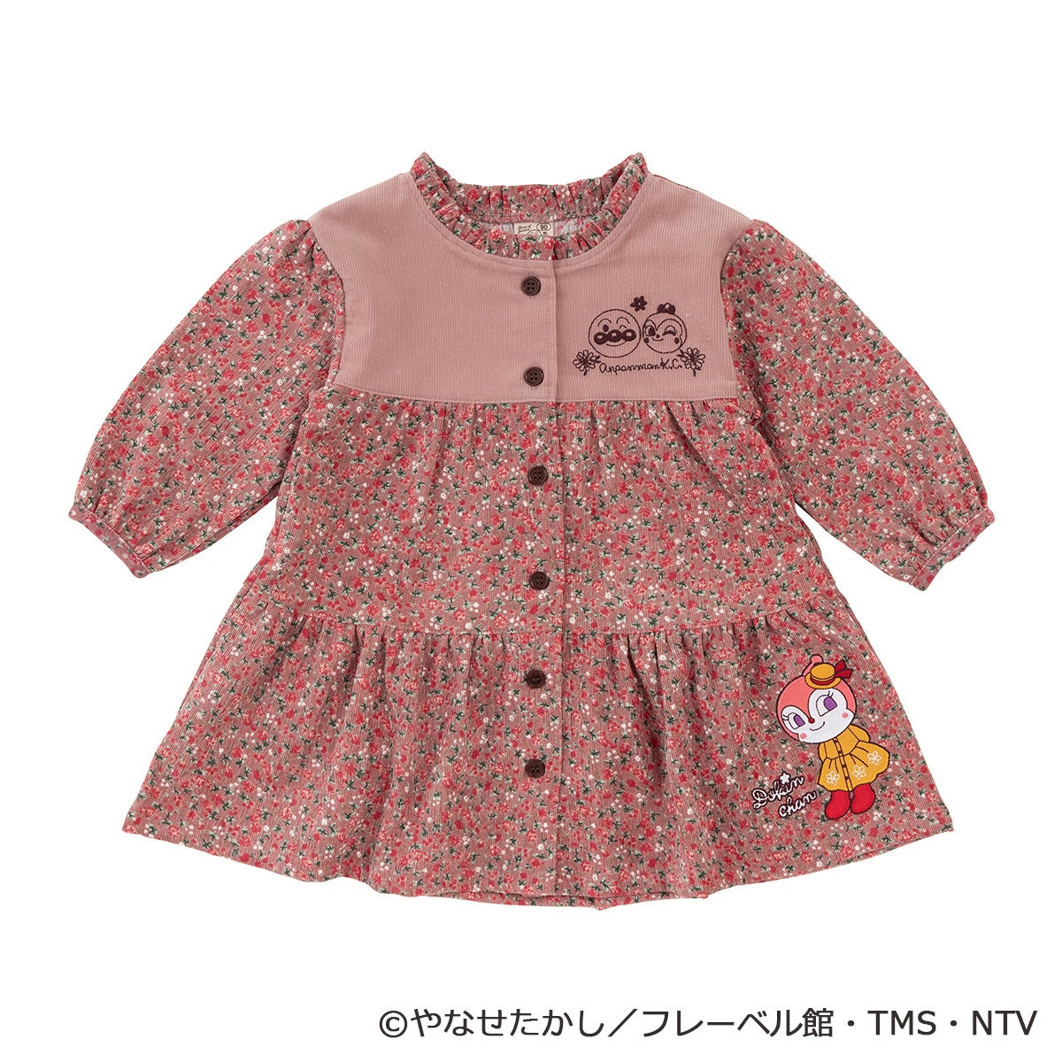ワンピースを着たドキンちゃんのアップリケが可愛らしい小花柄のワンピースです。胸元にはアンパンマンとコキンちゃんも刺繍でデザインされています。秋冬にピッタリなコーデュロイの生地を使用しており、一枚でおしゃれに決まるアイテムです。