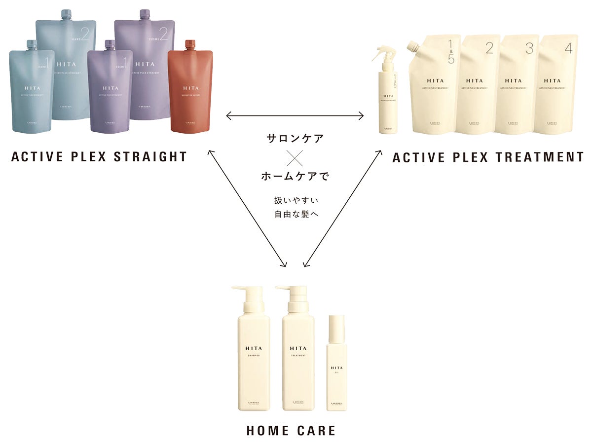 この度発売する「HITA(ヒタ)」シリーズは、高い水分保持力と、蝶つがいのような構造的やわらかさを持つ最新のテクノロジー「アクティブプレックス」を、サロンメニューである“アクティブ プレックス ストレート”と“アクティブ プレックス トリートメント”に搭載し、その効果を持続させる“ホームケア”の3つのラインで構成。さまざまなクセ毛を素髪のようにしなやかに美しく、「自分の髪が好き」と思えるような仕上がりの提供を目指し、開発いたしました。