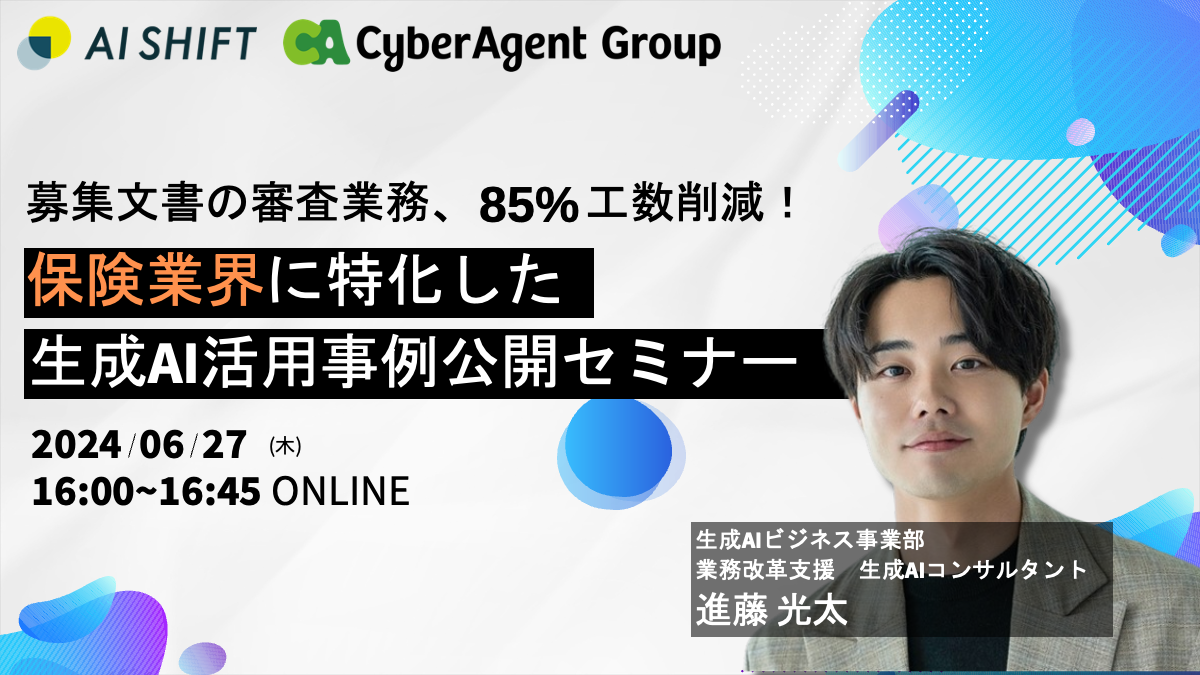 今回のセミナーでは、これまでAIシフトサービスの生成AI業務改革支援を通してご支援してきた中でも大きな工数削減を実現し、ご好評いただいている保険業界における生成AIの活用事例を紹介いたします。