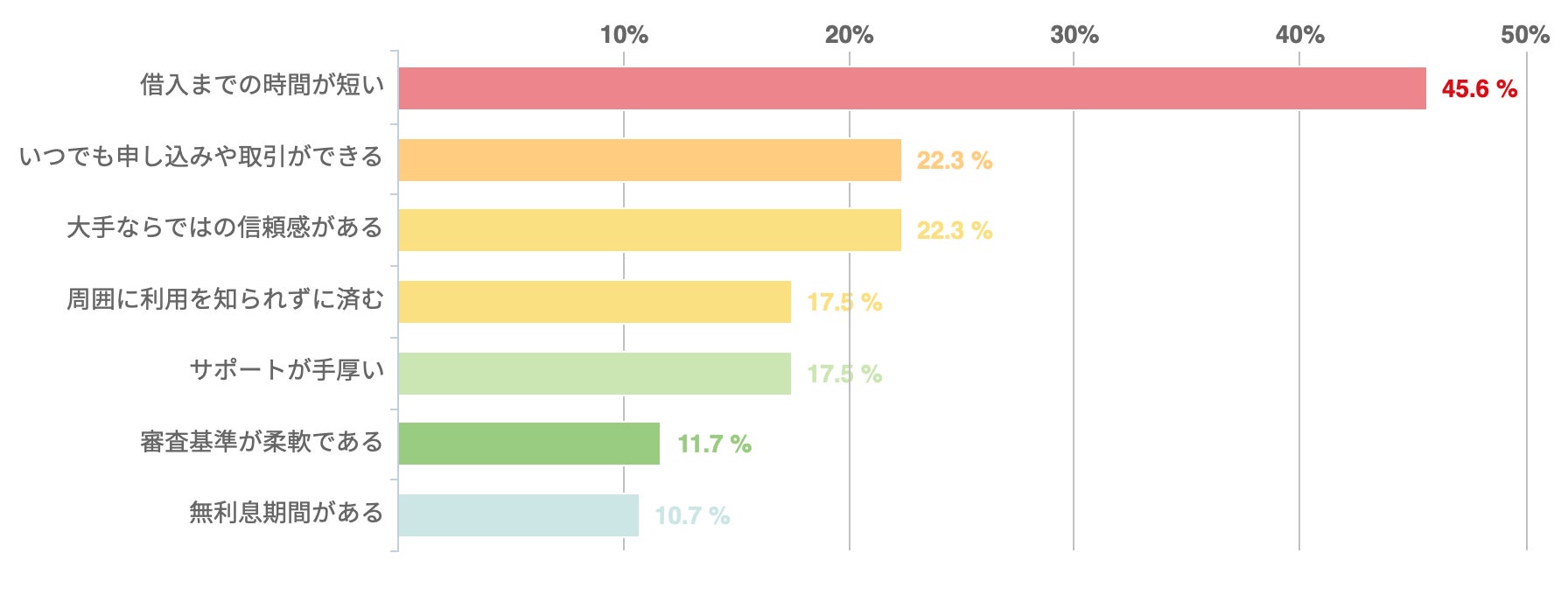 また、「いつでも申し込みや借入・返済ができる」「大手ならではの信頼感がある」といった点もそれぞれ22.3%の利用者が挙げており、「ATMや自動契約機がそこら中にあるので使いやすい」「TVのCMでよく見るので、安心して利用できる」といった意見が見られた。