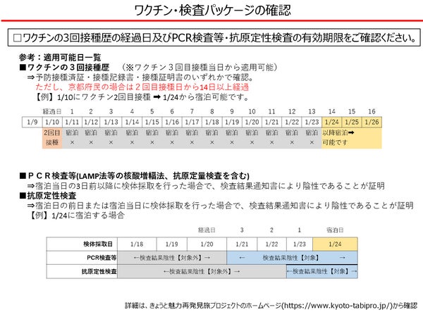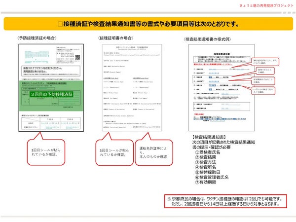 接種済証またはPCR検査等結果通知書(撮影画像、コピー、電子的な証明書でも可)の確認は、同行者も含めて旅行者全員について実施しますので、チェックイン時(旅行会社の場合は予約証明書等お渡しの来店時)にご提示ください。提示のない場合は割引支援を受けることができません。