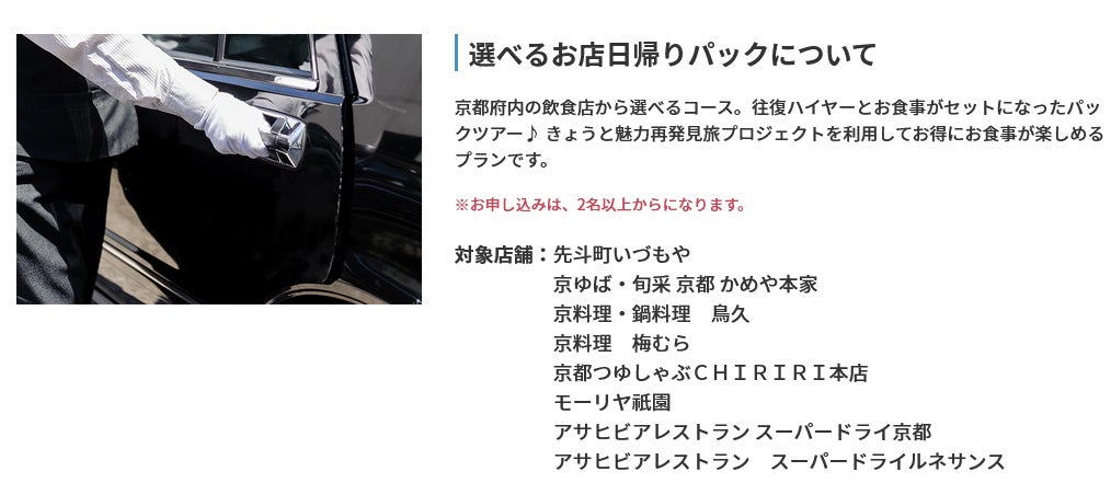 京都府内の飲食店から選べるコース。往復ハイヤーとお食事がセットになったパックツアー♪ きょうと魅力再発見旅プロジェクトを利用してお得にお食事が楽しめるプランです。