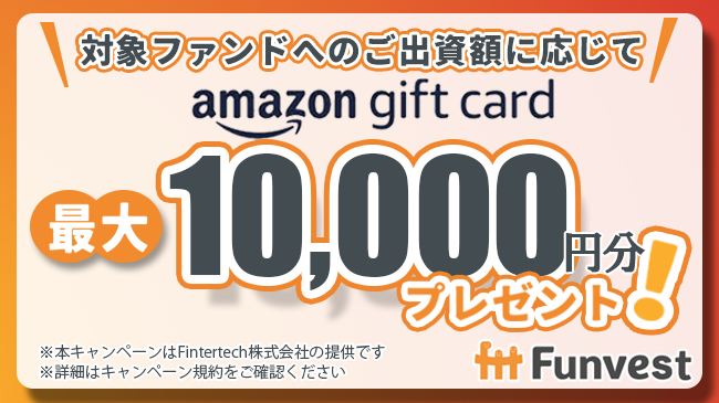本ファンドへ出資していただいた投資家の皆様を対象として、出資額に応じて最大10,000円分のAmazonギフトカードをプレゼントするキャンペーンも併せて実施いたします。