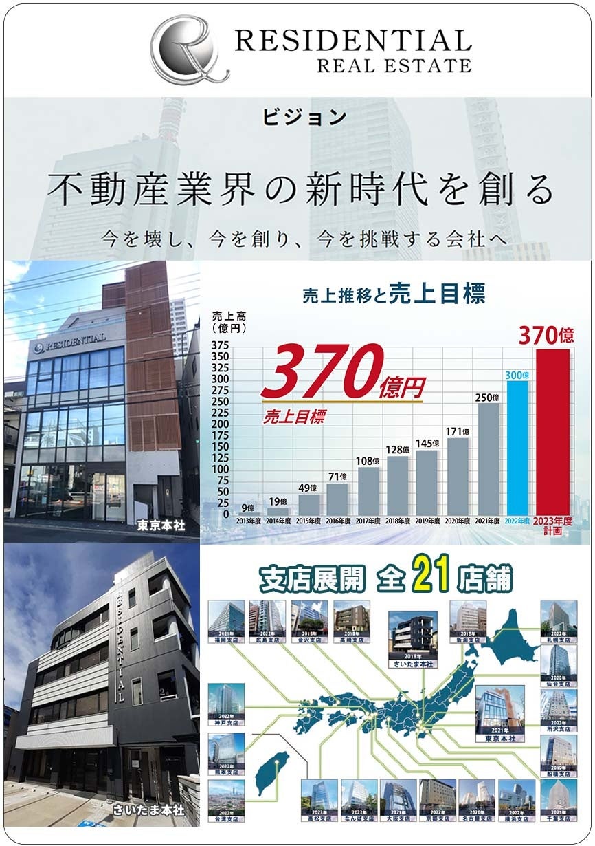 株式会社レジデンシャル不動産は、2012年に設立され、その後約10年で売上高250億円を達成、2023年1月期は売上高300億円を超え、現在急成長中の企業です。事業の中核は「マンションの再生・販売事業」であり、的確なエリアマーケティングや、コストパフォーマンスが同社の強みです。