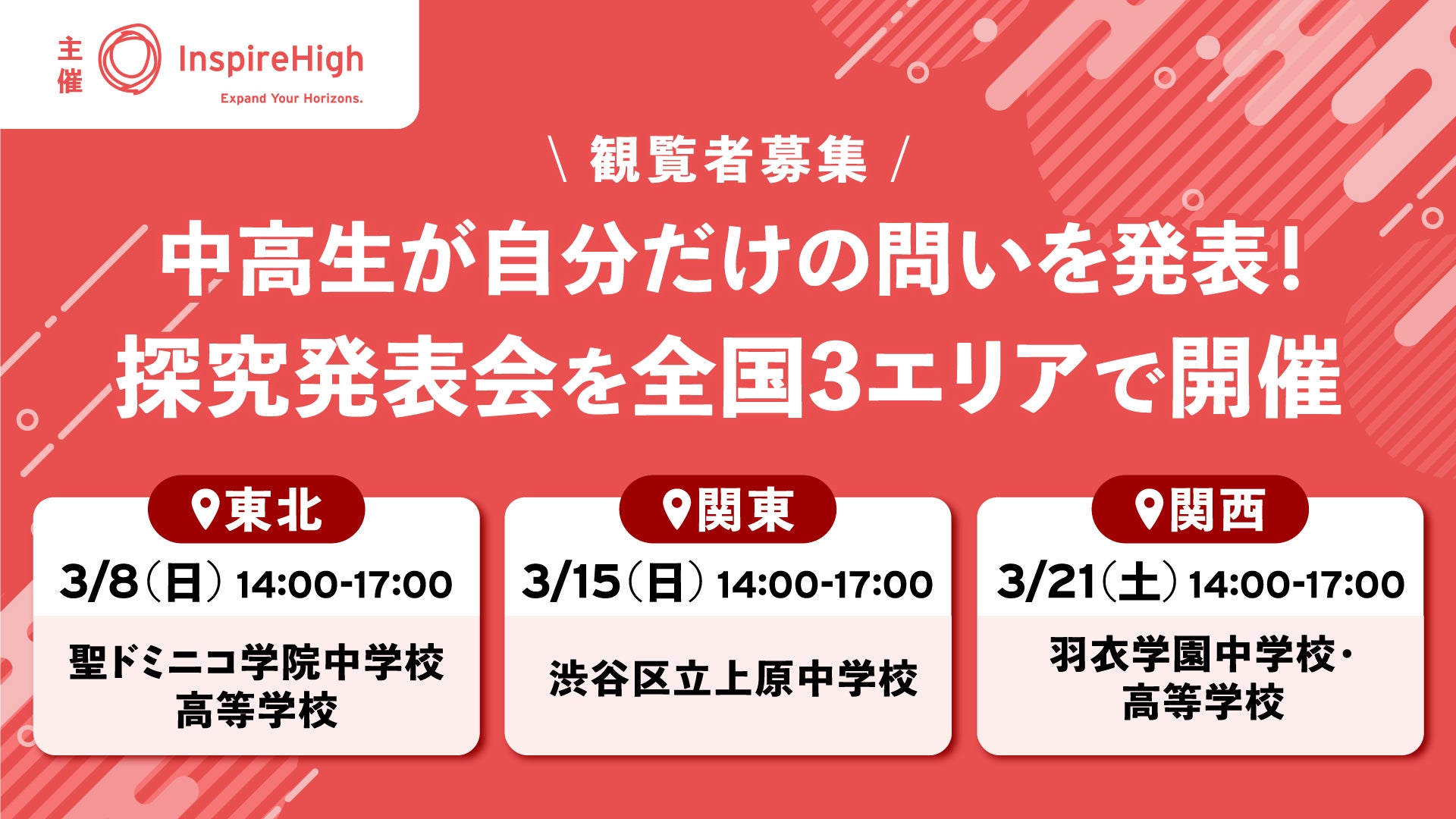 「世界とつながる探究的な学びを手軽に教室で」をコンセプトとしたEdTech教材を提供する、株式会社Inspire High(本社:東京都千代田区、代表:杉浦太一)は、全国の中高生が自身の探究の成果を共有する探究発表会を、2026年3月に東北・関東・関西の3エリアで開催いたします。