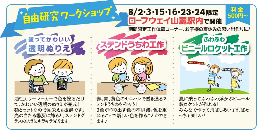※自由研究ワークショップはお子様の夏休みの宿題となる保証はございませんが、楽しく親子で何かを作るきっかけとなるものです。※自由研究ワークショップはロープウェイ代金のほか別途費用がかかります。