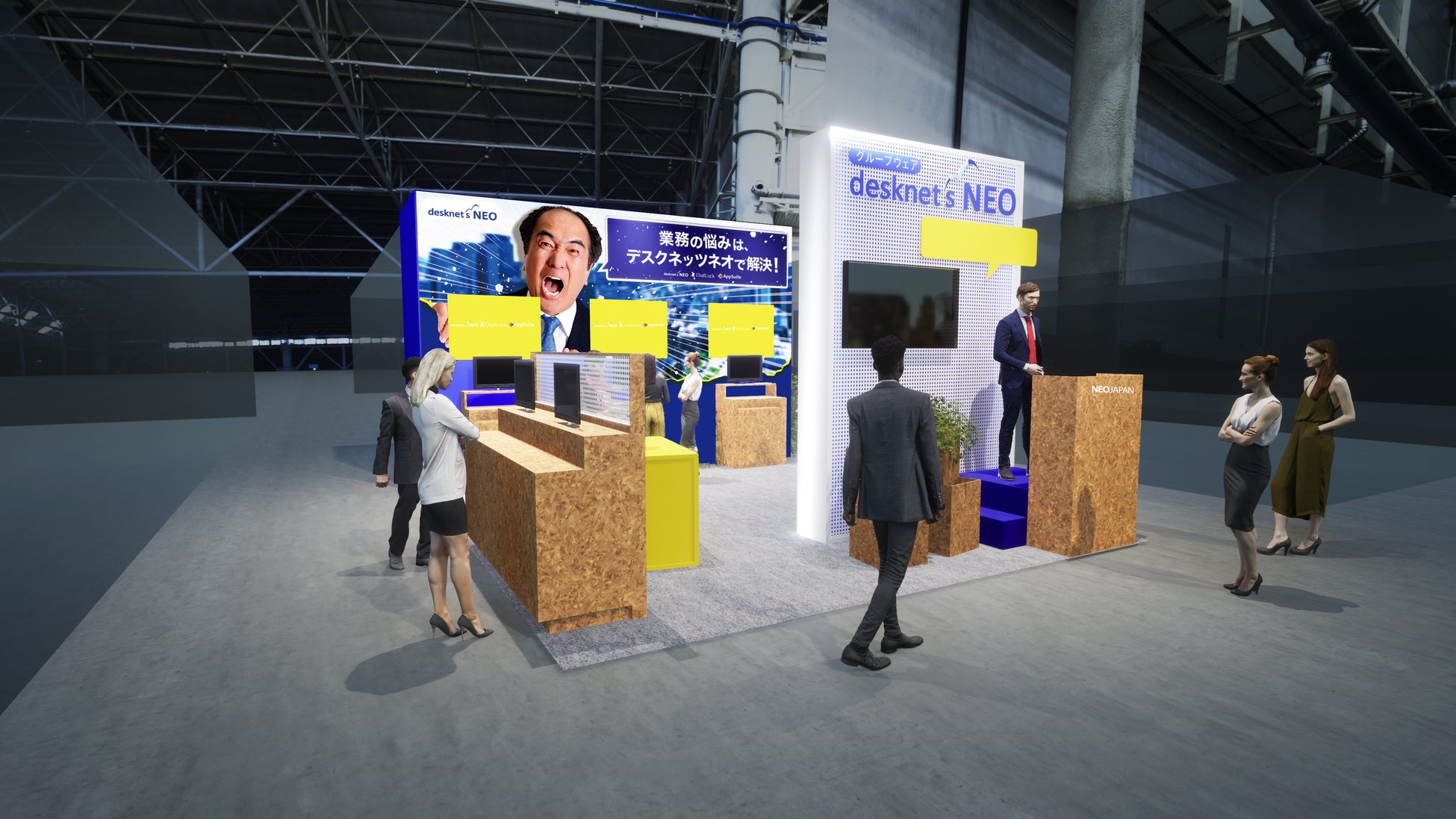 今回のネオジャパンブースでは、グループウェア「desknet's NEO」のTVCMキャラクターである江頭2:50さんを起用したブースを出展いたします。壁面には、江頭2:50さんのインパクトのあるビジュアルを大きく配置し、来場者の目を惹くデザインとなっています。ブース内では、desknet's NEOの他にも、ビジネスチャット「ChatLuck」やノーコードアプリ作成ツール「AppSuite」のデモも体験できます。是非、江頭2:50さんを目印に弊社ブースまでお越しください。