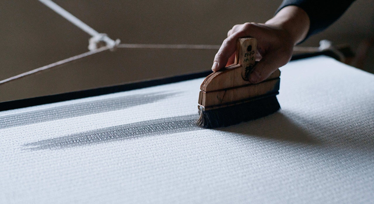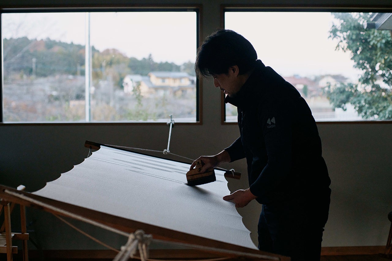 今回は一般的な丹後ちりめんよりもシボが大きい「うずら」と呼ばれる生地を使っています。斎田さんの作風に合わせて織機を改造し、特別に仕立てたものです。この真っ白な絹地にスッと線を引くように刷毛を動かす「引き染め」によって、FASのキーカラーであるブラックを基調に墨が水面に滲んでいくような様子を表現していただきました。