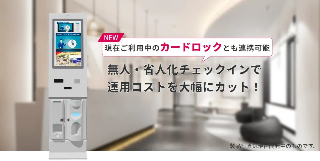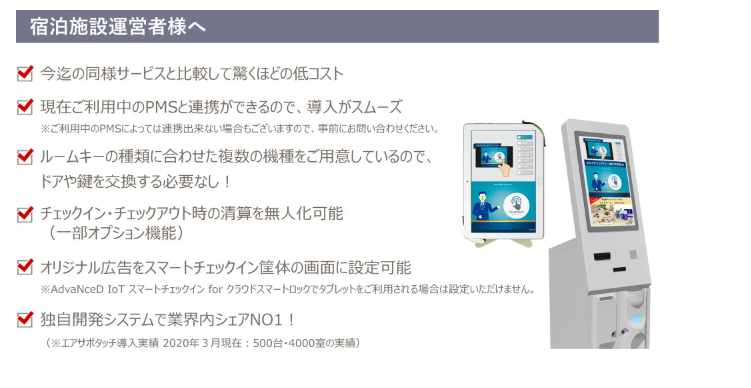 「AdvaNceD IoT スマートチェックインシリーズ」は、宿泊施設で現在利用しているカードロックや物理鍵の自動排出と回収ができるのでチェックイン・チェックアウト業務の無人化・省人化、及び運用コストの大幅なカットを実現するソリューションです。
